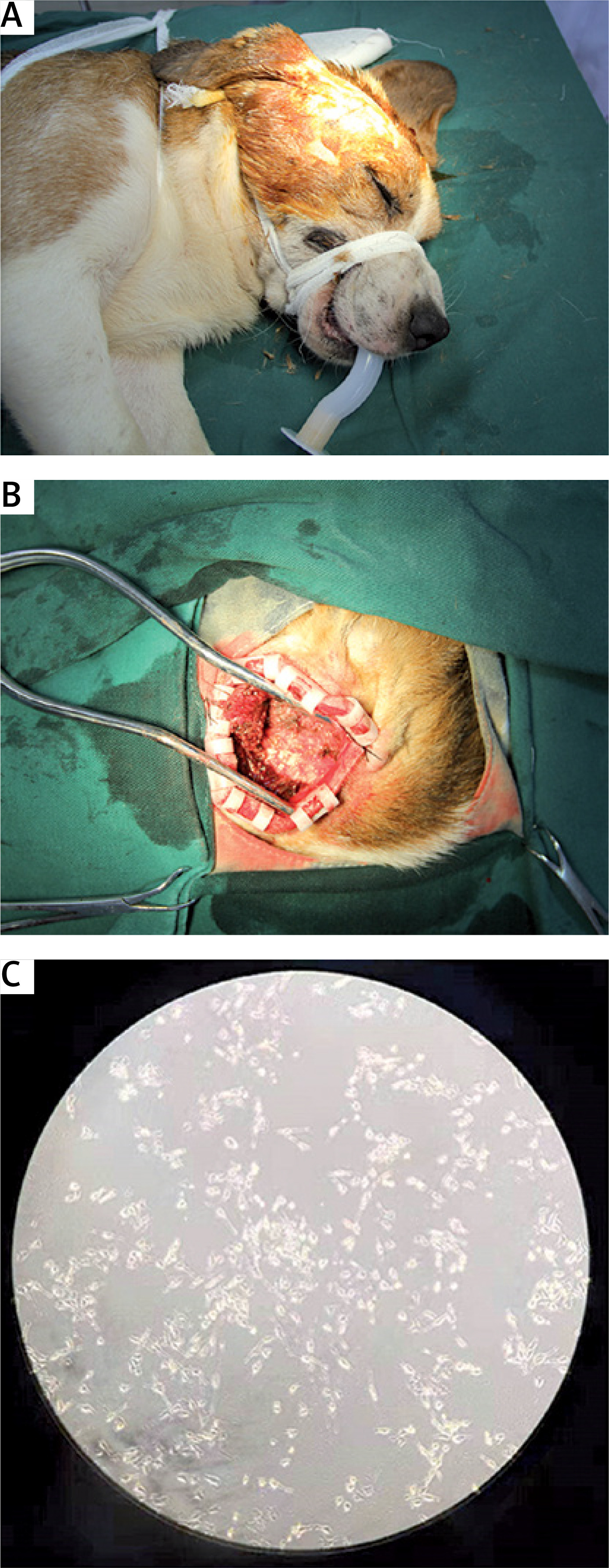 Beagle canine heat shock injury model. A – The Beagle dog is placed in the lateral position, the head is rotated to the opposite side, and the ear edge is pulled toward the midline and the caudal side. B – Craniotomy was performed through a sacral approach. After the craniotomy was fully performed, the subcutaneous tissue was turned to the lateral bone flap, and the bone window was as close as possible to the skull base. C – Primary microglia (100 ×, magnification)