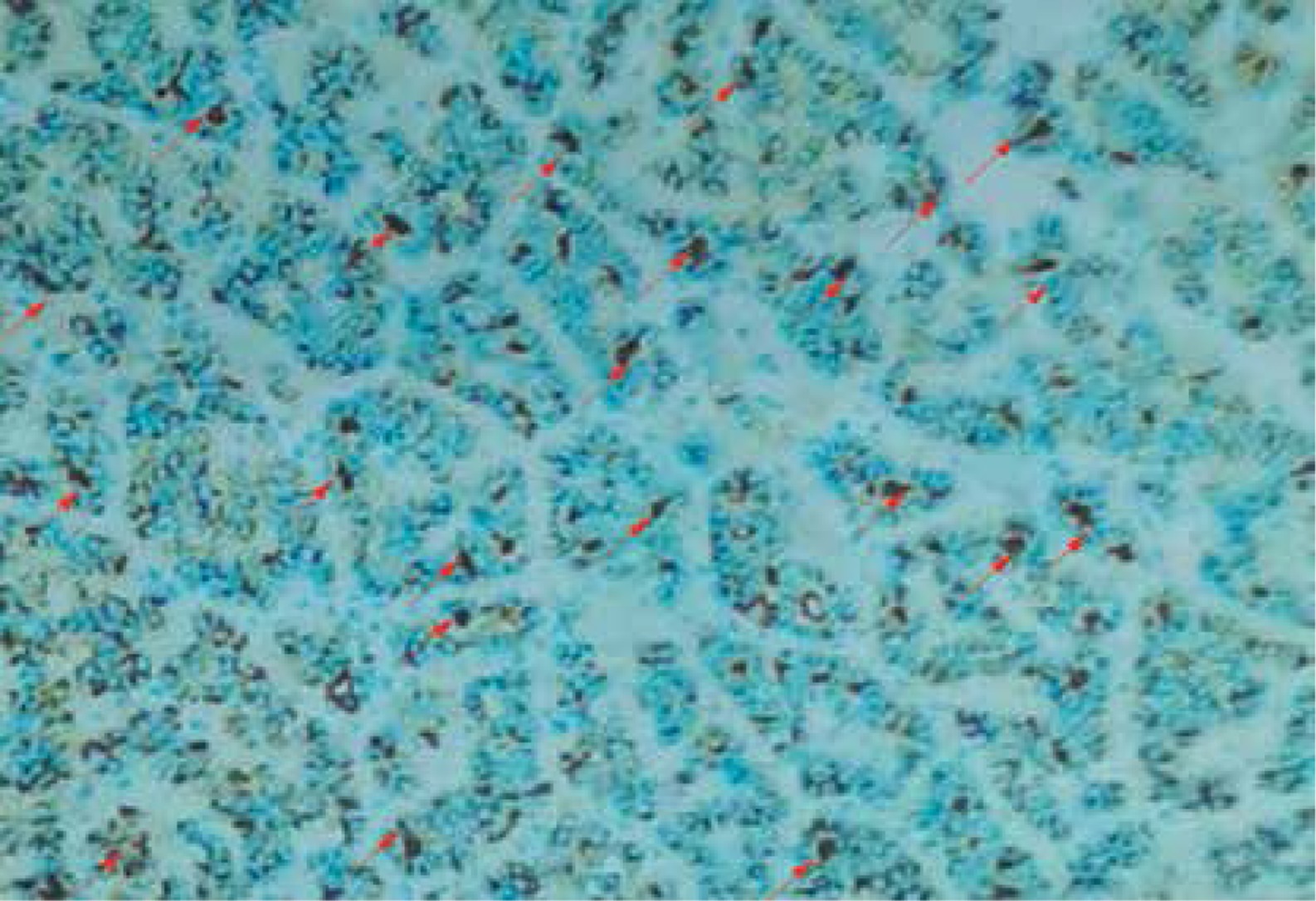 The pathology study showed that the mass in the left rear side of the esophagus was hypercellular parathyroid tissue, compatible with parathyroid adenoma (immunohistochemical staining for PTH, 100× magnification). The cells had no atypia with positivity for PTH (red arrows). PTH immunoreactivity was assessed using standard immunohistochemistry methodology. In short, formalin-fixed, paraffin-embedded tissue was cut into 4 μm sections. Then sections were incubated with anti-PTH at 1 : 200 dilution (NCL-PTH-488, Leica Biosystems; Wetzlar, Germany) at 4°C overnight, followed by a secondary antibody at 1 : 200 dilution (B-200, Vector Laboratories, Burlingame, CA, USA) for 45 min at room temperature. Immunoreactivity was visualized by the avidin-biotin-peroxidase complex method