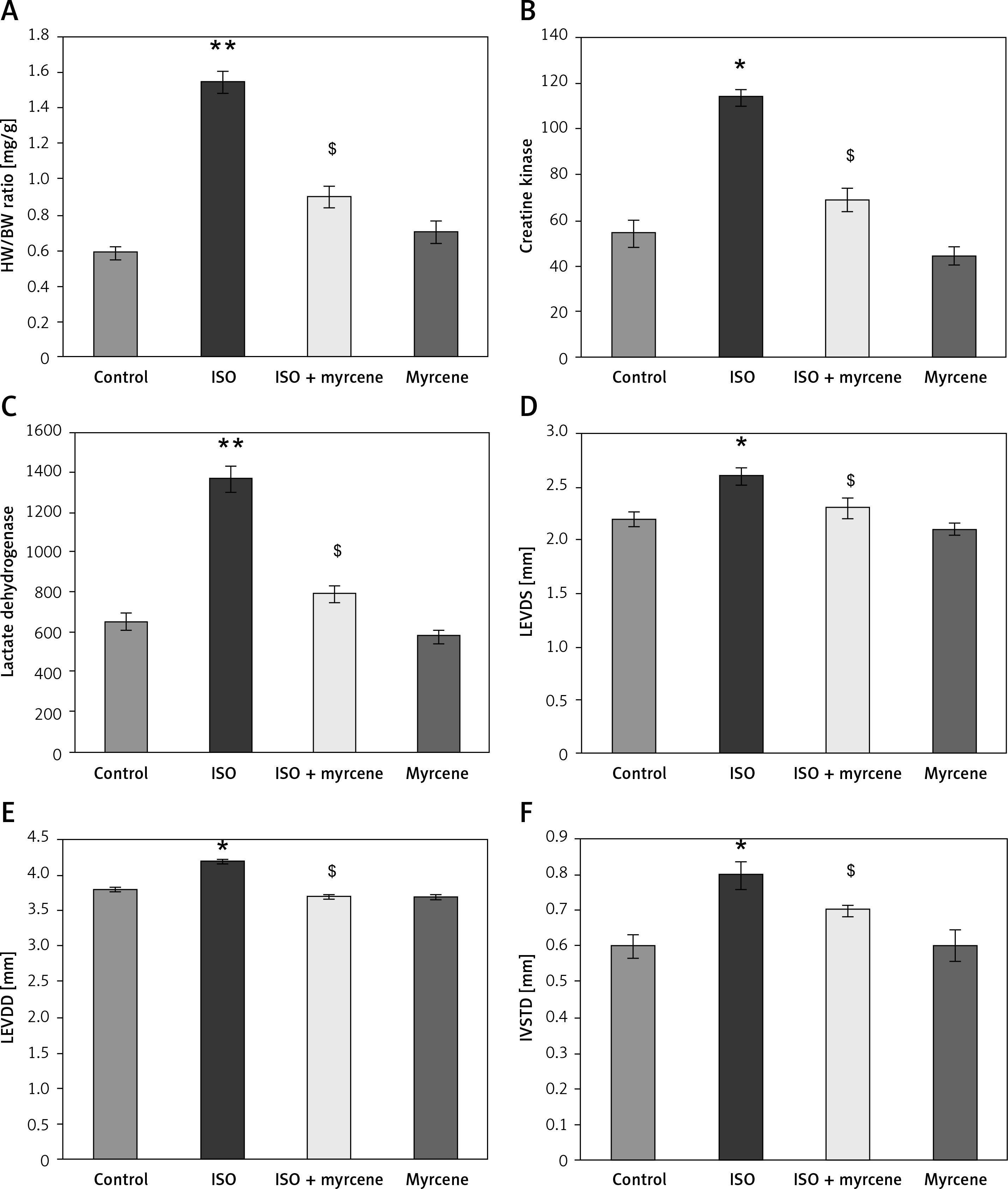 The present study aimed at evaluating the cardioprotective mechanism of myrcene by which the rescue signalling was activated in an experimental model of heart failure and the results presented below. Figure 1 shows significant (p < 0.01) increases in the HW/BW ratio, levels of creatinine kinase (CK), lactate dyhydrogenase (LDH), troponin I, and modulated echocardiographic parameters in ISO-induced rats compared to controls, while rats pre-treated with myrcene displayed restored cardiac functions with decreased levels of CK, LDH, and troponin I compared to ISO-induced rats (Figure 1).