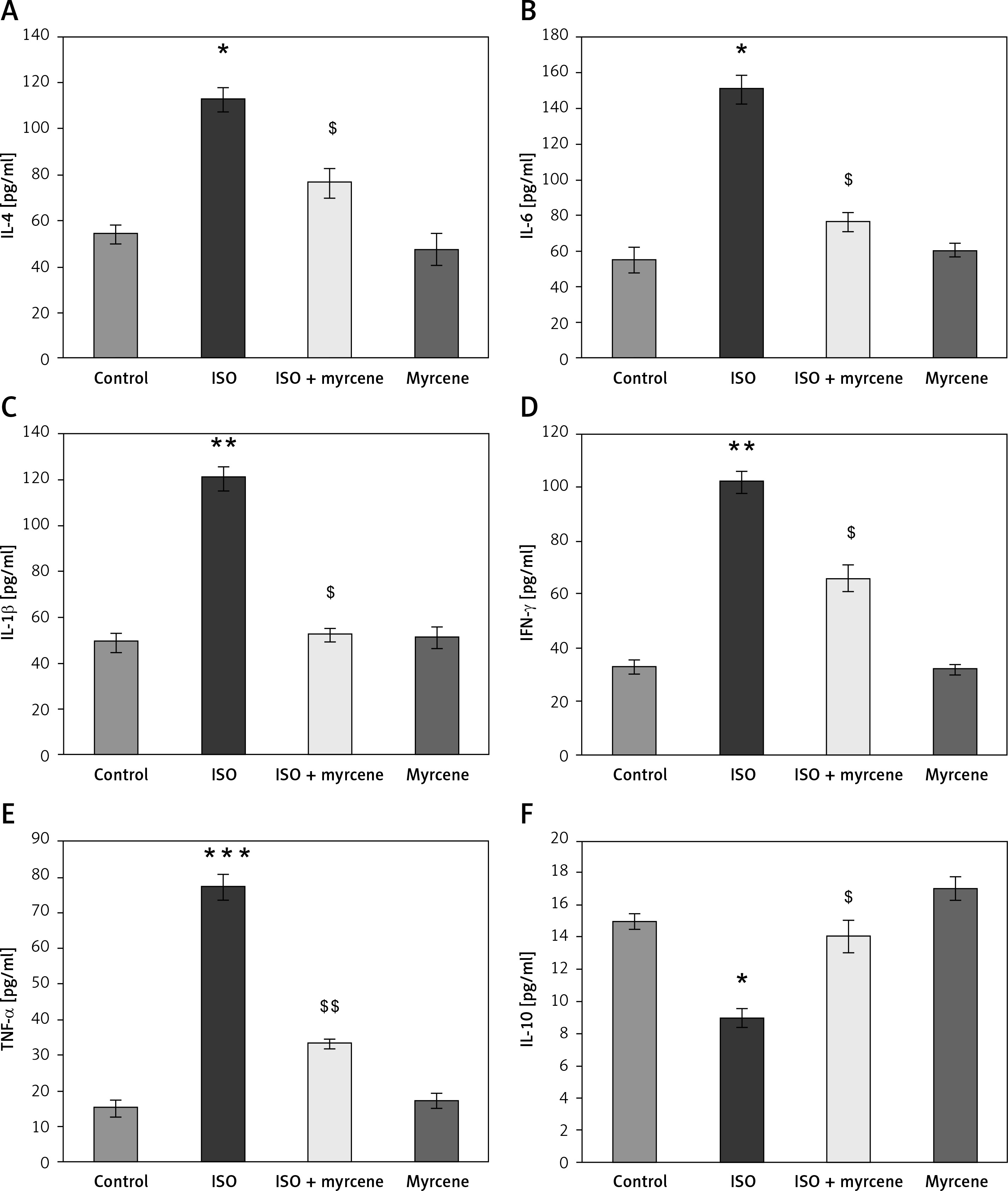 Furthermore, the cytokine levels were estimated in controls, and the levels in experimental rats are presented in Figure 3. The results show that the increased levels of cytokines such as IL-6 (p < 0.01), IL-4 (p < 0.05), (p < 0.05) TNF-α (p < 0.01), IFN-γ (p < 0.01), and IL-1β (p < 0.05) with reduced IL-10 levels were found in ISO rats compared to controls. These inflammatory cytokines were diminished in the myrcene pre-treatment with improved IL-10 levels (p < 0.01), showing that the protective role of myrcene is through blocking aggravation of the inflammatory signalling in the cardiac tissues (Figure 3).