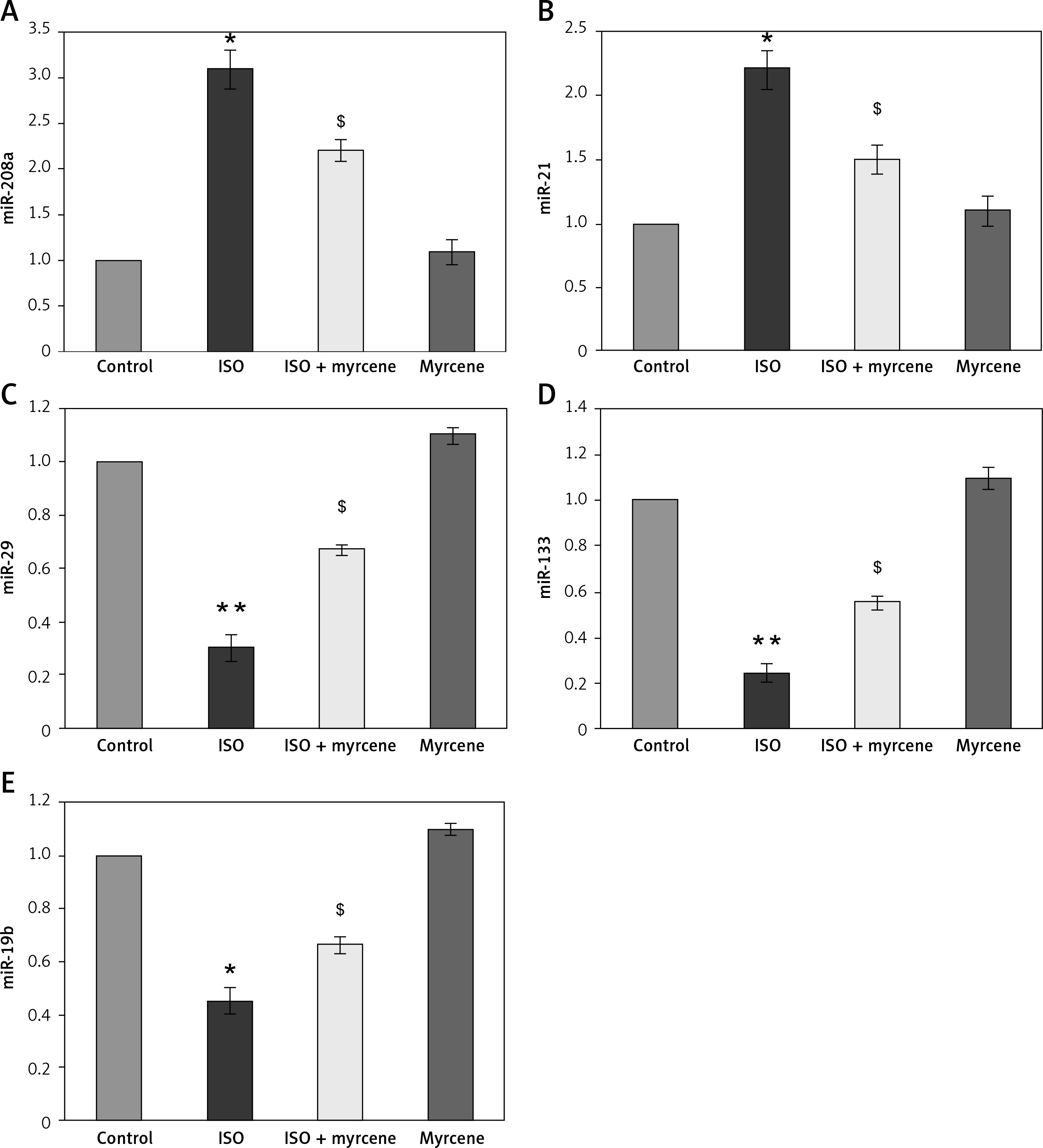 The role of myrcene in the cardioprotective role via microRNAs was evaluated using PCR. Figure 5 shows the expression level of these microRNA, and the results demonstrated the increased level of miR-21 (2.2.-fold) and miR-208a (3.1-fold) with reduced levels of anti-fibrotic miR-29, miR-19b, and miR-133 in ISO-induced rats. While the levels of these miRs were restored (p < 0.01) in myrcene, pre-treatment suggests that the interplay of microRNAs is one of the clues in the aggravation of heart failure (Figure 5).