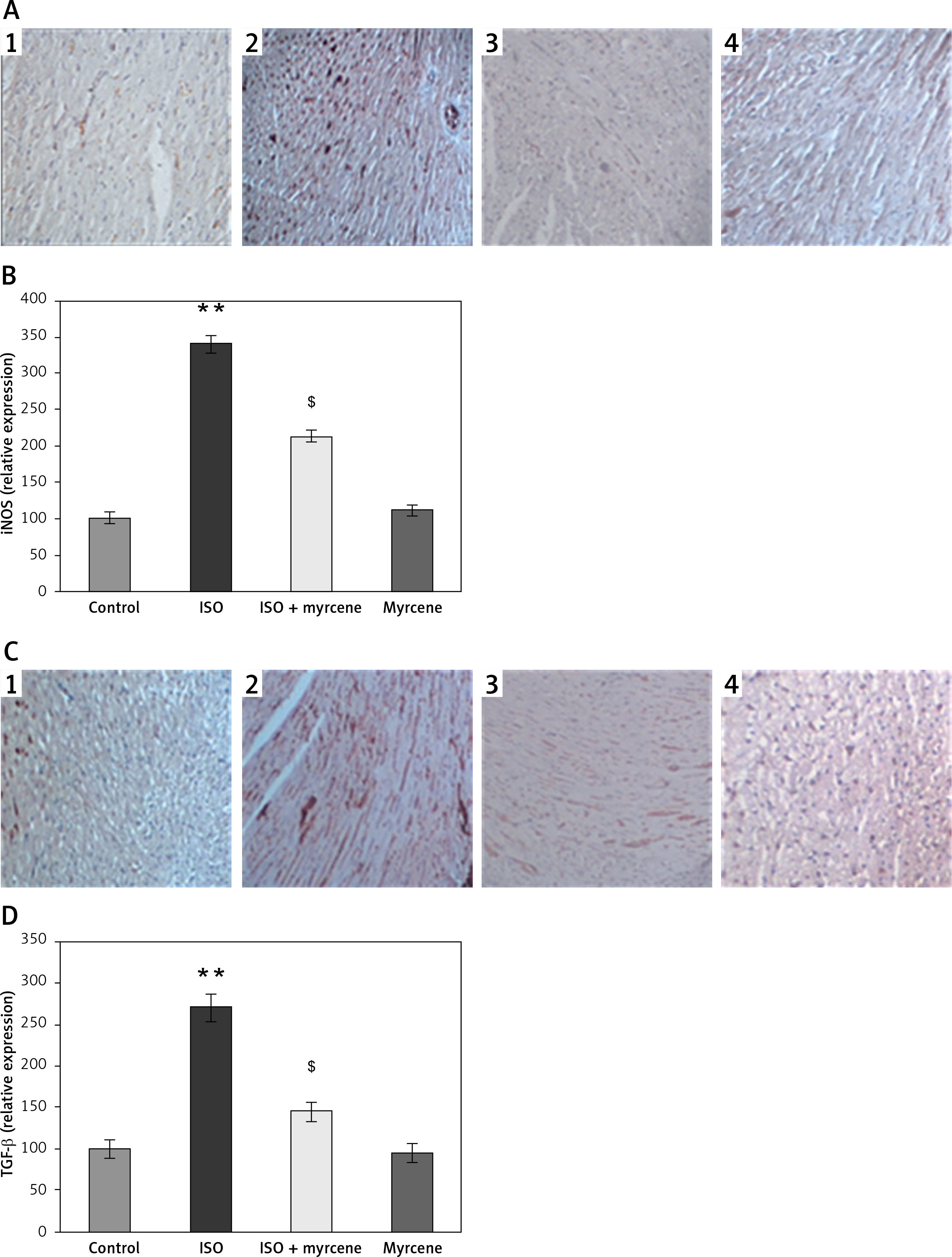 A–D represents the immunohistochemical (IHC) analysis of iNOS and TGF-β in the control and experimental groups of rats (1 – Control; 2 – ISO; 3 – ISO + myrcene; 4 – Myrcene). The detail of the experiment is given in the methodology section