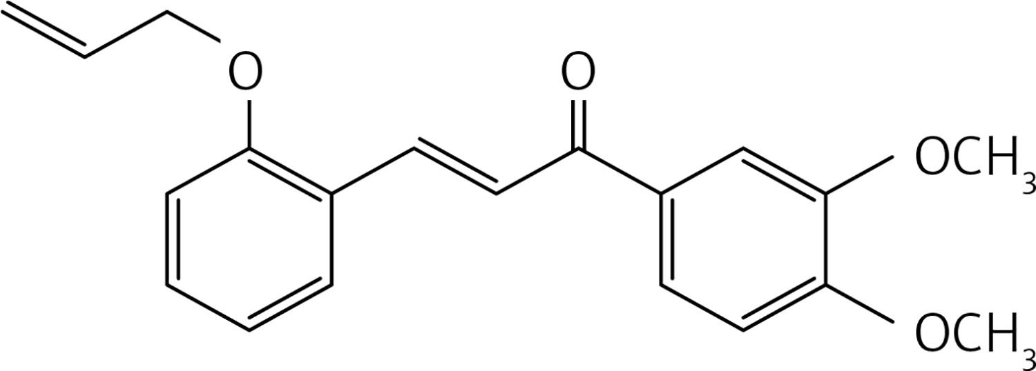 To a solution of 2 (allyloxy) benzaldehyde [32] (1 g, 6.2 mmol) and 3,4-dimethoxy acetophenone (1.1 g, 6.2 mmol) in MeOH (10 ml) a solution of LiOH (0.89 g, 37.2 mmol) in MeOH (5 ml) was added dropwise. The reaction mixture was stirred at reflux for 12 h. The solution was acidified with HCl 10% solution and extracted with dichloromethane (2 × 30 ml). The organic phases were dried over Na2SO4 and concentrated in vacuo. The crude product was purified by flash chromatography using dichloromethane as eluent to give product 30 (Figure 17) as a white solid (1.25 g, 62%): mp 87–88°C; 1H NMR δ 3.95 (s, 3 H), 3.96 (s, 3 H), 4.61 (d, J = 5.2 Hz, 2H), 5.26-5.47 (series of m, 2H), 6.08 (m, 1H), 6.88 (d, J = 8.0 Hz, Ar, 1H), 6.97 (t, J = 6.8 Hz, Ar, 1H), 7.31 (dt, J = 1.6, 4.8 Hz, Ar, 1H), 7.60-7.68 (series of m, Ar, 4H), 7.70 (d, J = 16 Hz, 1H), 8.10 (d, J = 16 Hz, 1H). 13C NMR δ 55.97, 56.05, 69.14, 109.97, 110.79, 112.46, 117.96, 120.92, 122.64, 122.97, 124.29, 129.58, 131.42, 131.54, 132.86, 139.65, 149.07, 153.02, 157.03, 189.14; Anal. Calcd. for C20H20O4: C, 74.06; H, 6.22; Found: C, 74.16; H, 6.29.