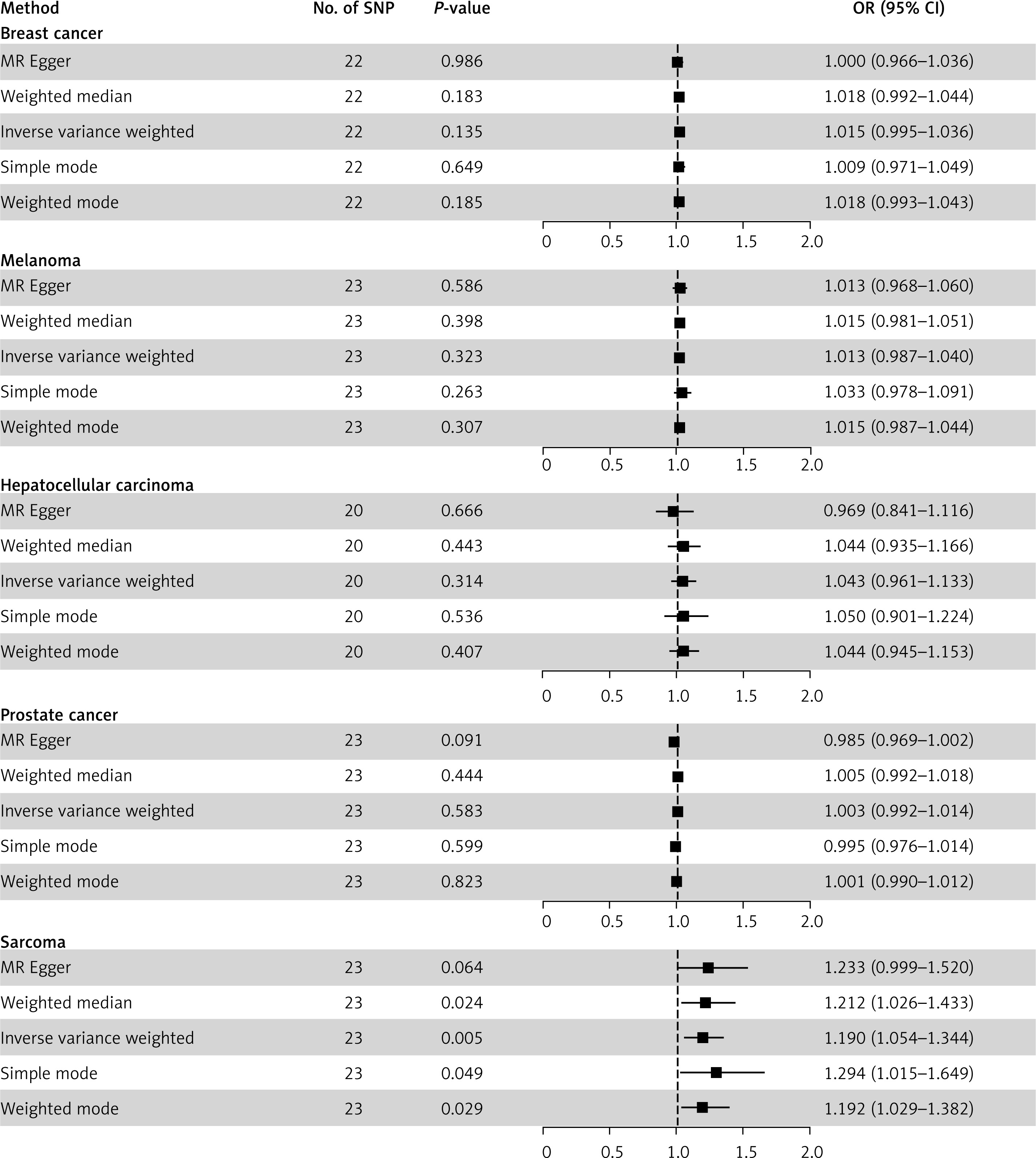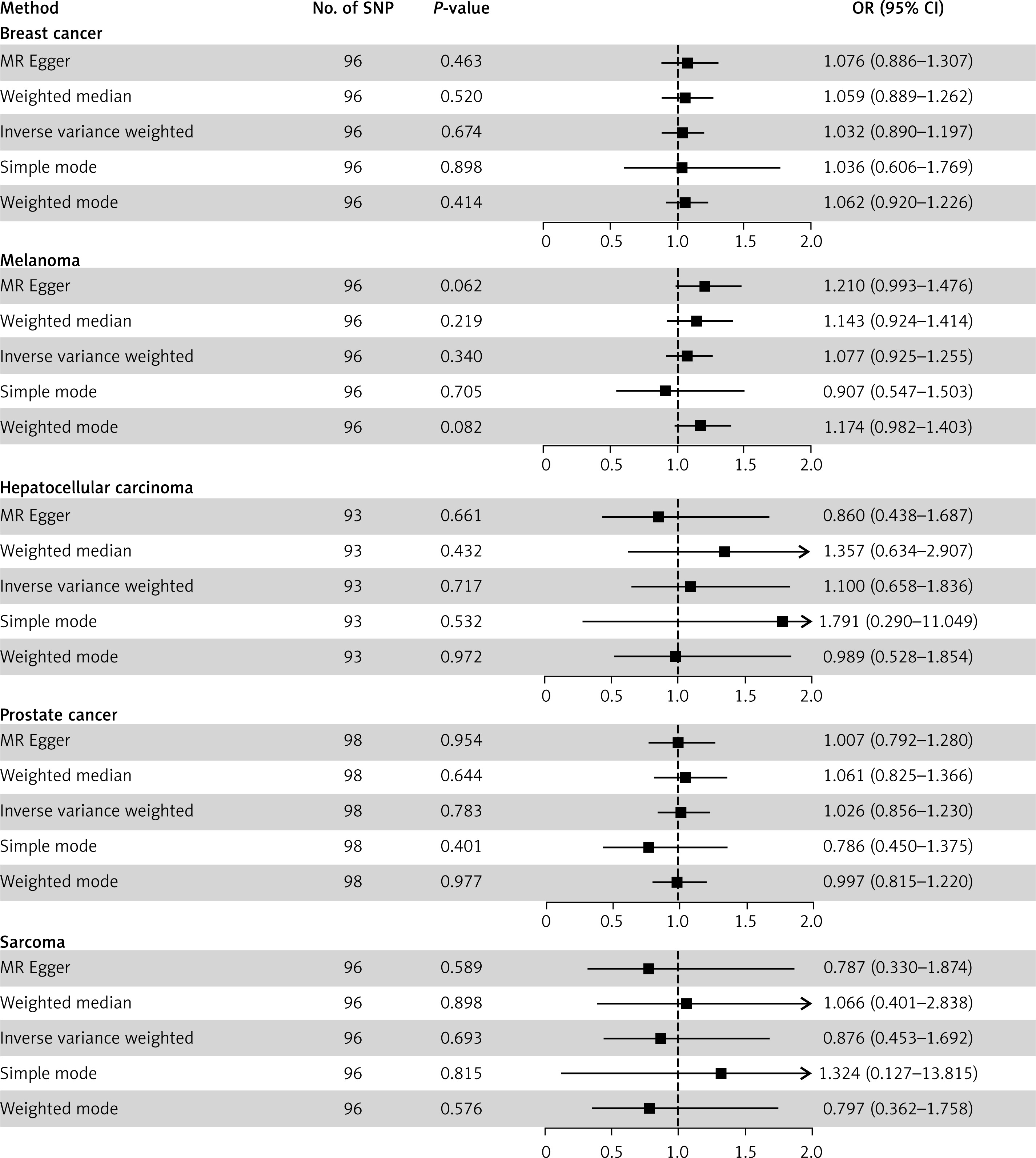 IVW, MR Egger, weighted median, simple mode, and weighted mode method consistently showed no evidence of a causal relationship between serum 25OHD and breast cancer (IVW: odds ratio [OR] = 1.032, 95% CI = 0.890–1.197, p = 0.674), melanoma (IVW: OR = 1.077, 95% CI = 0.925–1.255, p = 0.340), HCC (IVW: OR = 1.100, 95% CI = 0.658–1.836, p = 0.717), prostate cancer (IVW: OR = 1.026, 95% CI = 0.856–1.230, p = 0.783), and sarcoma (IVW: OR = 0.876, 95% CI = 0.453–1.692, p = 0.693) (Figure 1). Scatter plots are presented in Supplementary Figure S2.