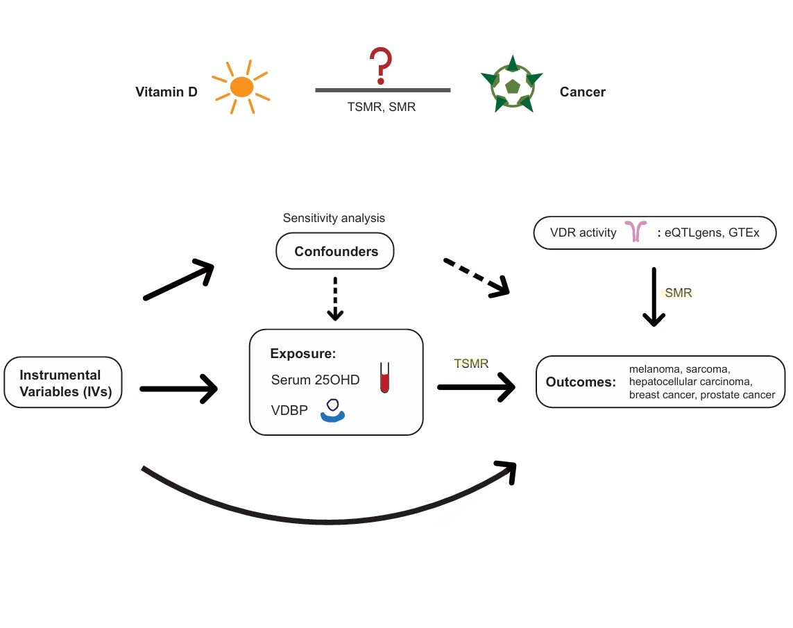 Jiang X, Dimou NL, Al-Dabhani K, et al. Circulating vitamin D concentrations and risk of breast and prostate cancer: a Mendelian randomization study. Int J Epidemiol 2019; 48: 1416-24..