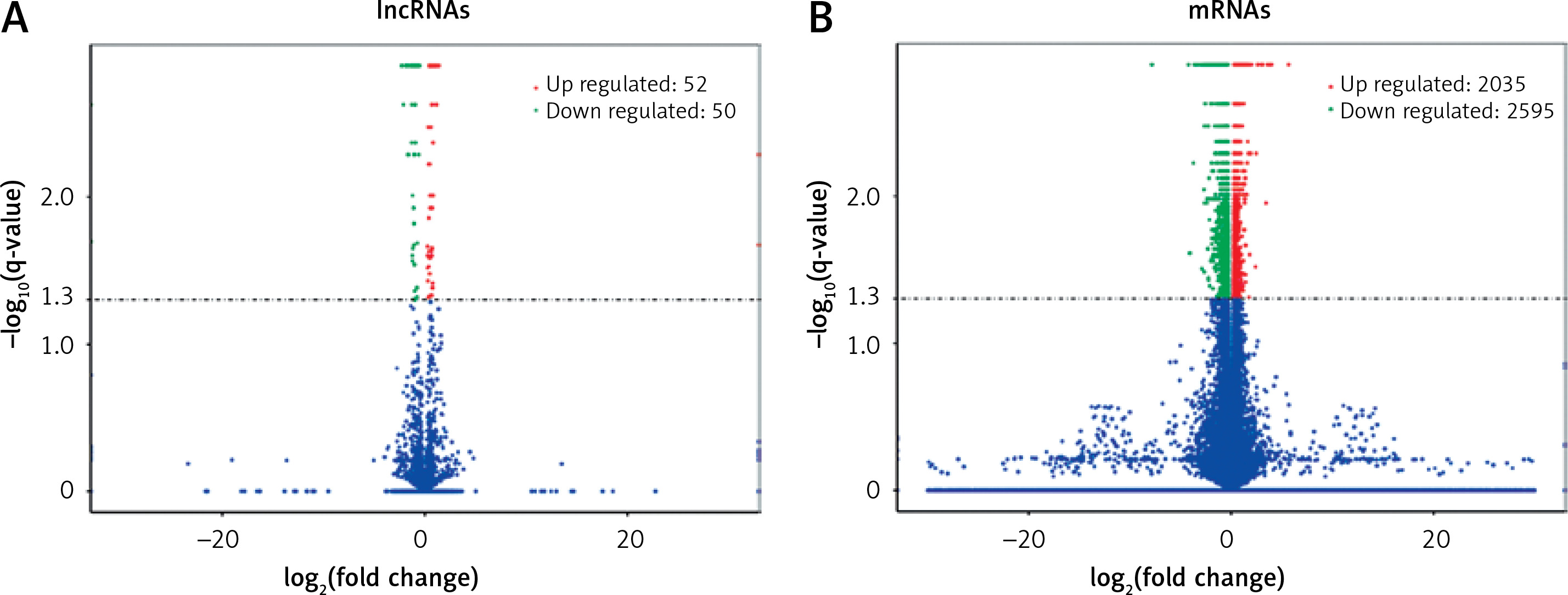 The expression profiles were compared between the main artery samples of the ART group and atherosclerosis group. Among a total of 3625 lncRNAs and 55831 mRNAs detected by high-throughput sequencing, there were significant differences in the expression of 102 lncRNAs and 4630 mRNAs (p < 0.05). Furthermore, 22 lncRNAs decreased and 5 lncRNAs increased in the ART group by showing significantly differential expression with an absolute log2 (fold change) > 1 (p < 0.05) (Table II). Among these differentially expressed lncRNAs, 50 lncRNAs decreased, and 52 lncRNAs increased in the ART group (Figure 2 A). Moreover, compared with the atherosclerosis group, in the ART group, 2595 mRNAs decreased, and 2035 mRNAs increased (Figure 2 B). The top 10 differentially expressed mRNAs are listed in Table III.