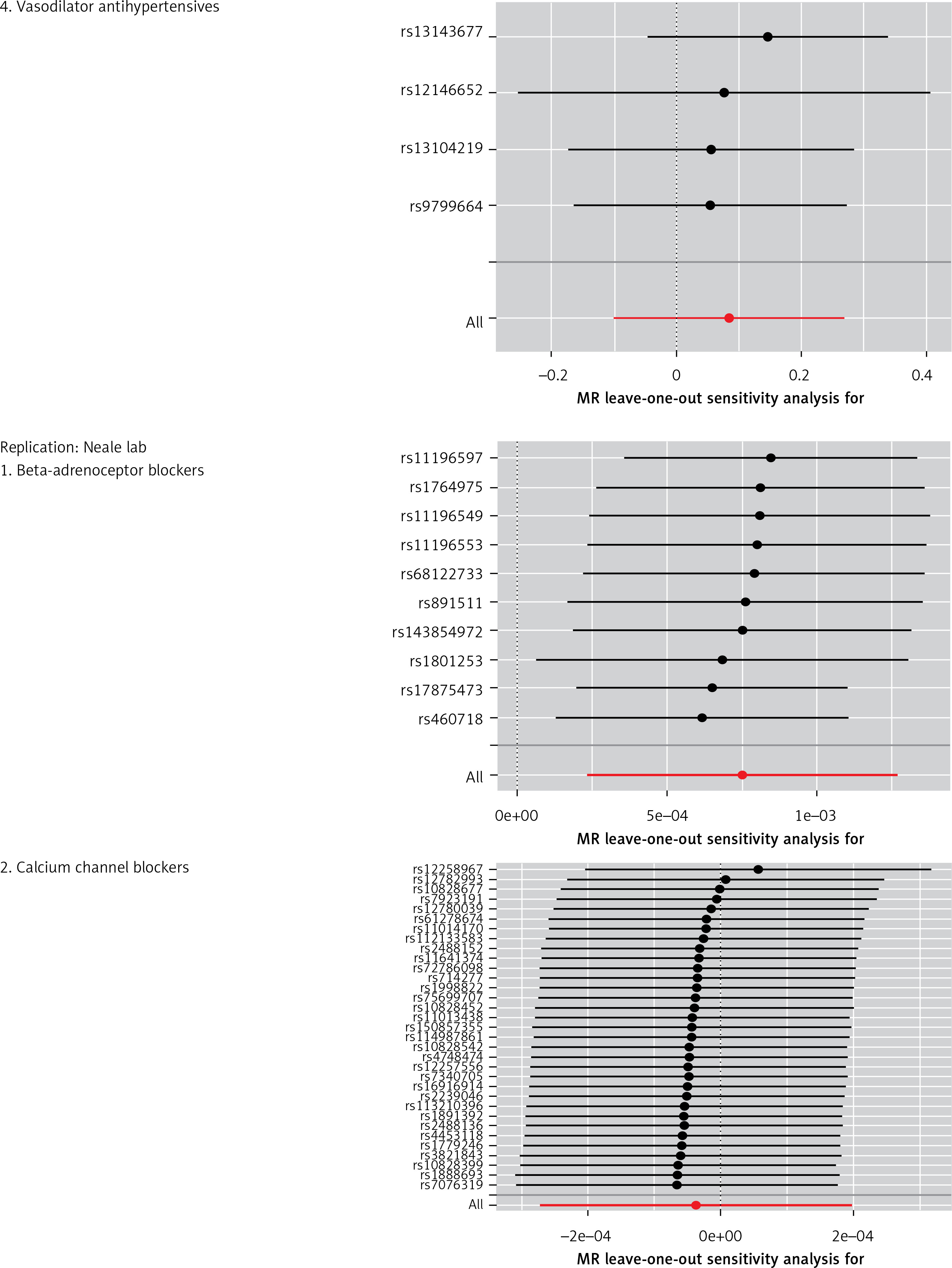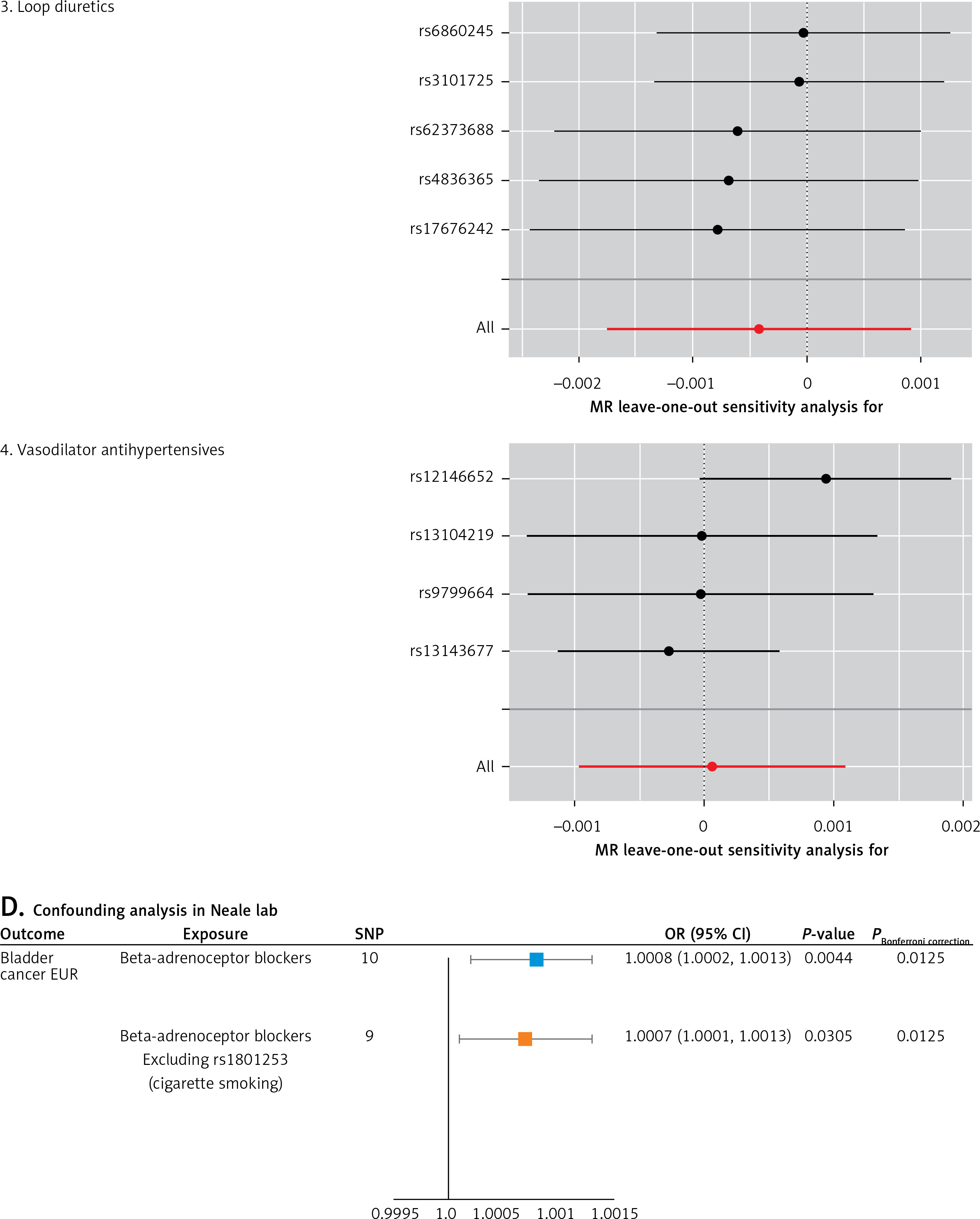 A – Forest plot map of Mendelian randomization (MR) analysis, utilizing genetic proxies for four classes of antihypertensive drugs, demonstrating their association with the risk of bladder cancer. The primary outcome is based on data from the FinnGen Biobank. B – Forest plot map of MR analysis, using genetic proxies for four classes of antihypertensive drugs, illustrating their association with the risk of bladder cancer. The secondary outcome is derived from the Neale lab dataset C – Leave-one-out analysis was conducted for the following antihypertensive drug classes: (1) β-adrenoceptor blockers, (2) calcium channel blockers, (3) loop diuretics, and (4) vasodilator antihypertensives. This analysis was applied to both the primary analysis of bladder cancer risk in the FinnGen Biobank and the replication analysis in the Neale lab C – Leave-one-out analysis was conducted for the following antihypertensive drug classes: (1) β-adrenoceptor blockers, (2) calcium channel blockers, (3) loop diuretics, and (4) vasodilator antihypertensives. This analysis was applied to both the primary analysis of bladder cancer risk in the FinnGen Biobank and the replication analysis in the Neale lab C – Leave-one-out analysis was conducted for the following antihypertensive drug classes: (1) β-adrenoceptor blockers, (2) calcium channel blockers, (3) loop diuretics, and (4) vasodilator antihypertensives. This analysis was applied to both the primary analysis of bladder cancer risk in the FinnGen Biobank and the replication analysis in the Neale lab. D – Confounding analysis was conducted to assess the impact of genetic proxies for β-adrenoceptor blockers, specifically focusing on the inclusion or exclusion of the rs1801253 (rs1801253: cigarette smoking), on the association with bladder cancer risk in the replication data from the Neale lab