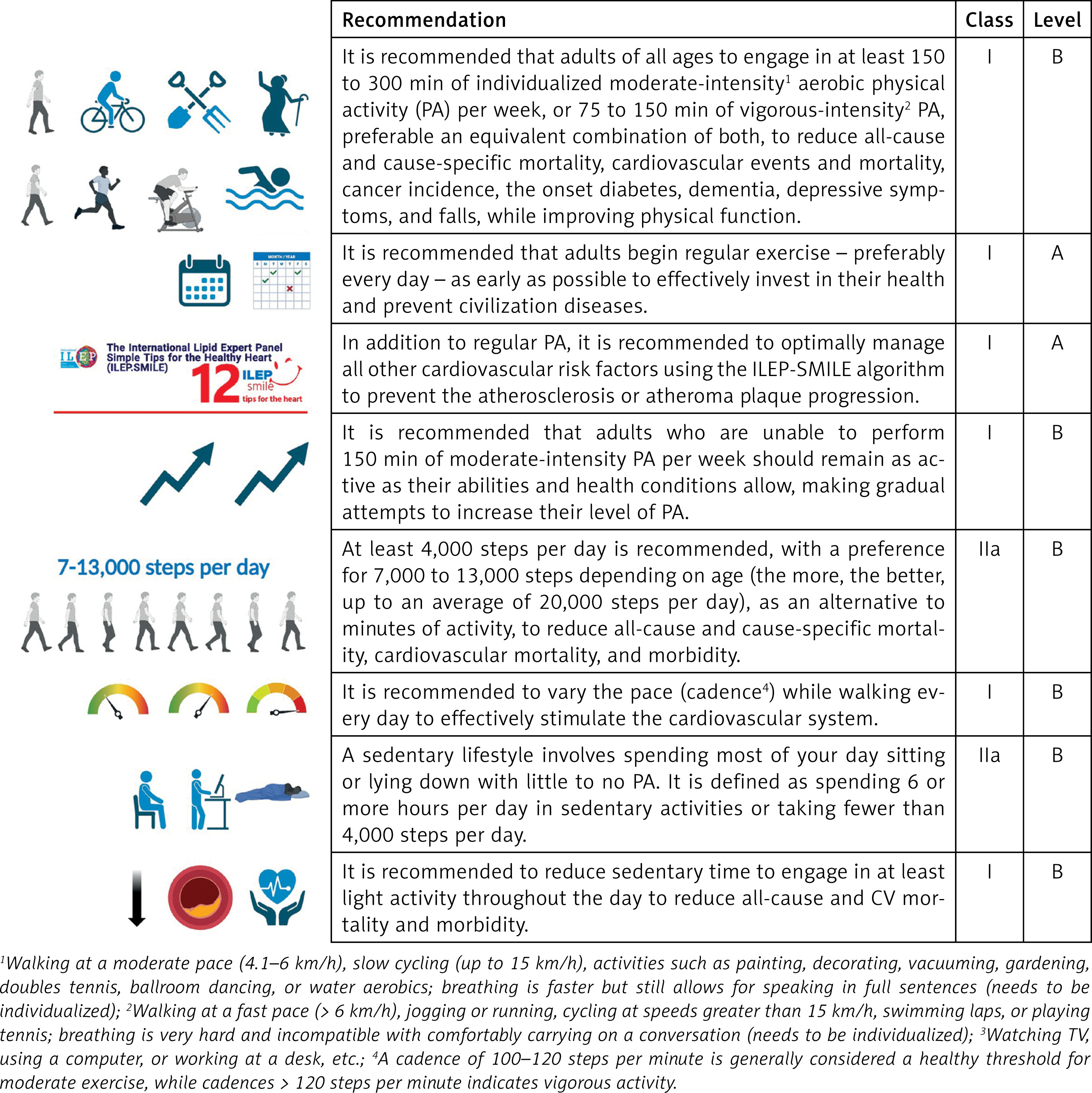 Despite some of the aforementioned points that may still raise questions for discussion, the authors of the meta-analysis [1] deserve congratulations for their remarkable effort and critically important results. Based on these findings and numerous other available data suggesting a significant association between daily steps and health outcomes [13], I firmly believe that, similarly to the recent International Lipid Expert Panel (ILEP) recommendations on simple tips for a healthy heart (ILEP-SMILE), which include step counts as part of the guidance (at least 4,000 steps per day; preferably 6–13,000 depending on age; and the more the better up to 20,000 steps/day) [10], daily step counts should be incorporated into all forthcoming guidelines (Figure 1).
