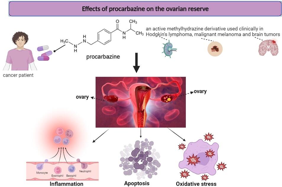 Chemotherapeutic agents frequently impact the ovary via diverse mechanisms, and recognizing which facets of ovarian function are impacted by these agents is essential. Oocytes and granulosa cells are vulnerable to injury caused by chemotherapy. Apoptosis, inflammation, and oxidative stress are the three principal mechanisms by which procarbazine is hypothesized to affect the ovaries, according to previous research [6].