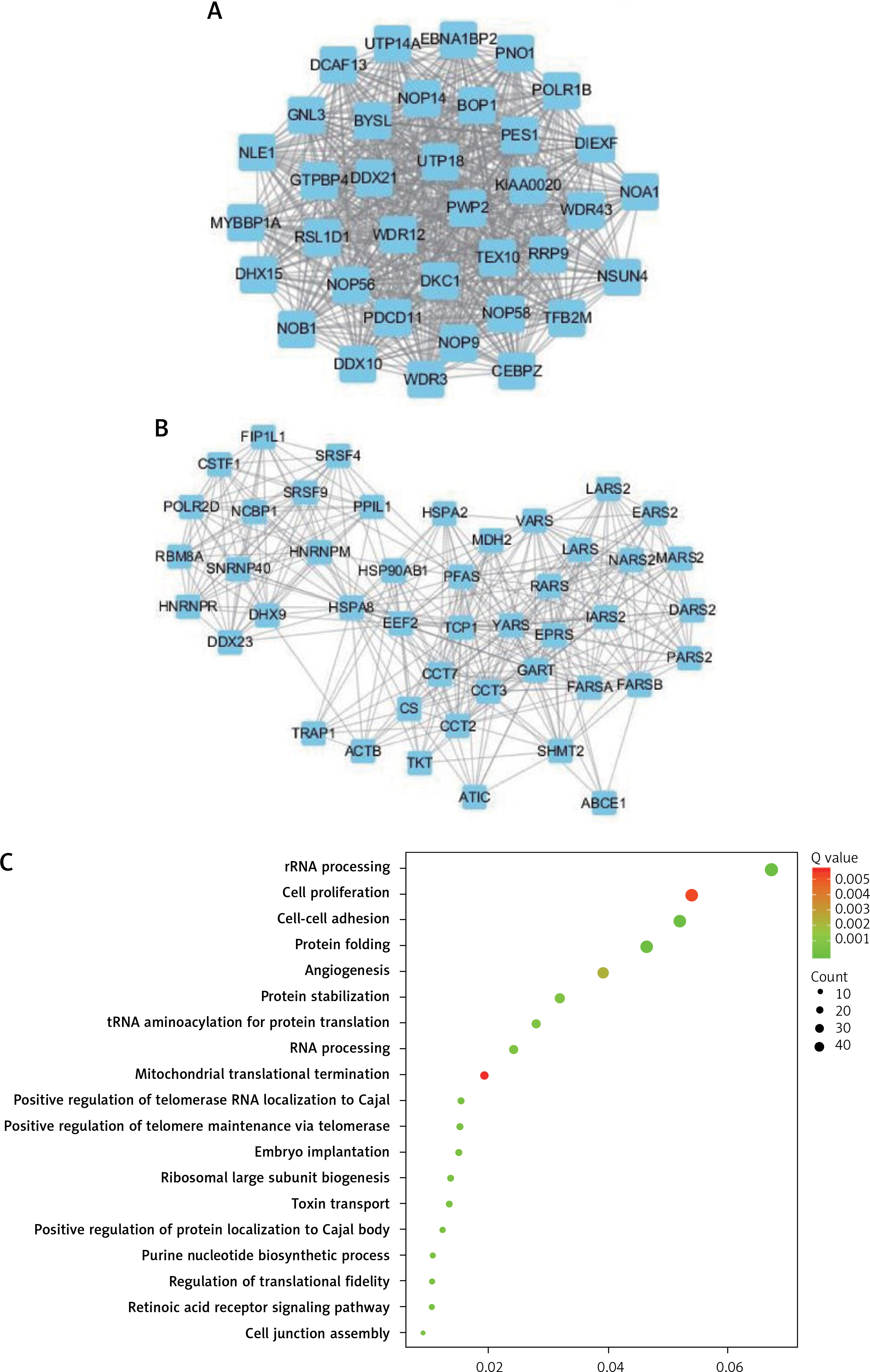 In order to explore the potential functions PRMT5 in PCa, the present study conducted co-expression analysis and protein-protein interaction (PPI) network analysis to identify the downstream targets of PRMT5. The top key up-regulated PPI (Figure 2 A) and down-regulated PPI networks (Figure 2 C) are shown in Figure 2. Bioinformatics analysis revealed that PRMT5 was involved in regulating multiple biological processes and pathways, such as cell junction assembly, angiogenesis, cell−cell adhesion, cell proliferation, and spliceosome (Figures 2 B and D). These analyses were consistent with previous studies indicating that PRMT5 could promote PCa proliferation.