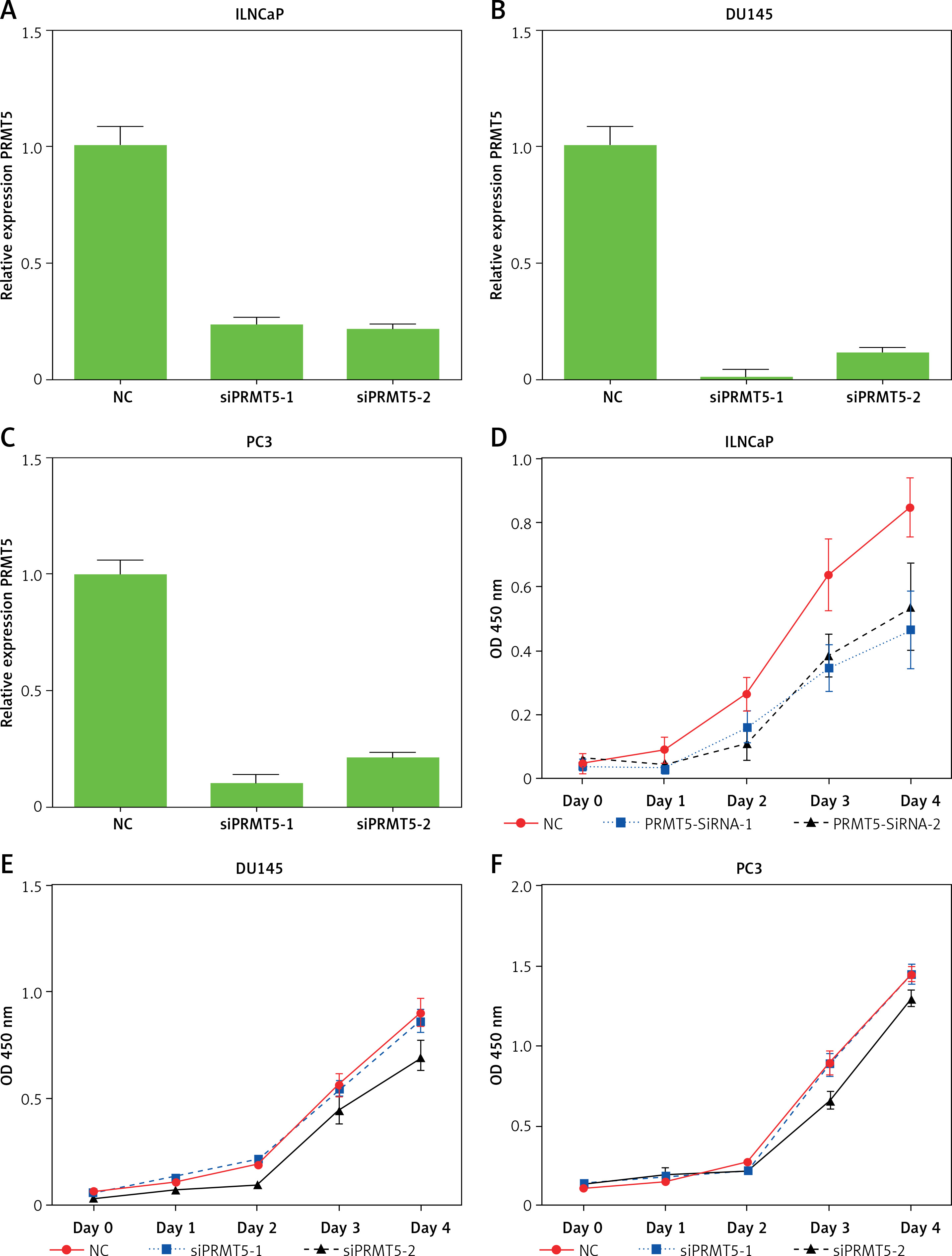 The siRNAs against the PRMT5 (siPRMT5-1, siPRMT5-2) and negative control (siNC) were synthesized by GenePharma (Shanghai, China). The PCa cells were seeded and transfected in 12-well plates using Lipofectamine 3000 (Life Technologies), in accordance with the manufacturer’s instructions. The following siRNAs were used: siPRMT5-1: 5′- CAACAGAGAUCCUAUGAUU -3′; siPRMT5-2: 5′- AAGAGGGAGUUCAUUCAGGAA -3′; and a scrambled siRNA control: 5′- AAGUGAUAGGAAGUCAGUACG -3′.