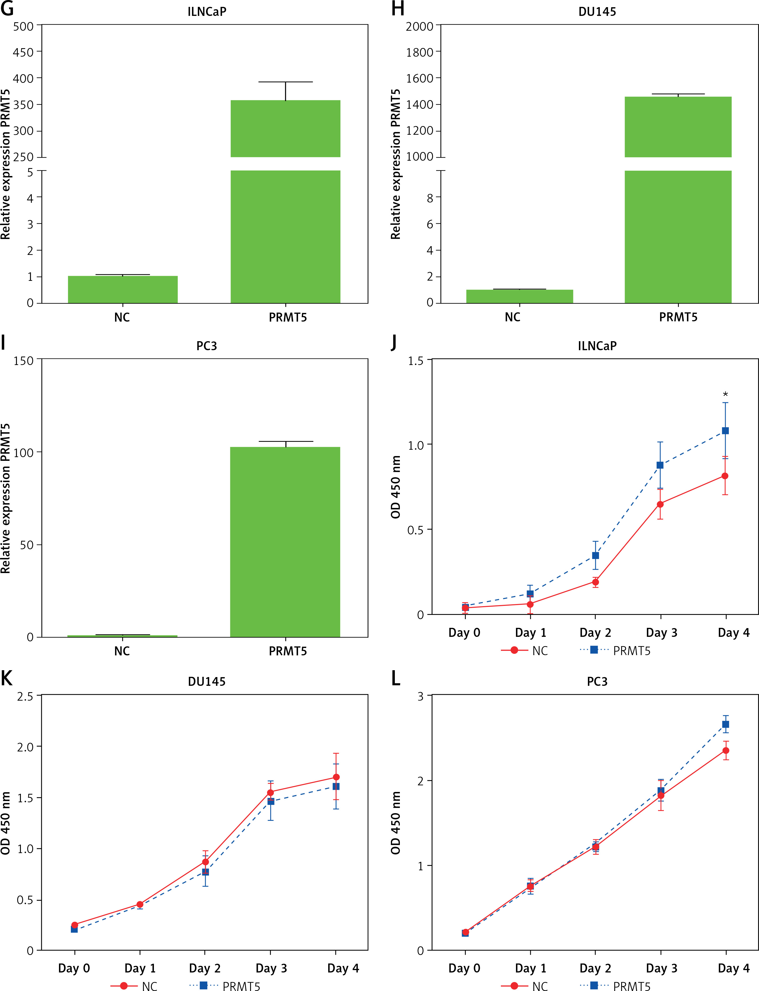 PRMT5 promotes proliferation of androgen-dependent PCa, not androgen-independent PCa. A–C – PRMT5-specific siRNA-1,2 substantially decreased PRMT5 mRNA levels in PCa cells LNCaP, DU145 and PC3. D – Knockdown of PRMT5 significantly reduced the proliferation rate of androgen-dependent PCa LNCaP cell line compared to cells treated with siNC (p < 0.001). E, F – Knockdown of PRMT5 did not affect the cell proliferation of androgen-independent PCa DU145 and PC-3 cells G–I – Overexpression of PRMT5 significantly increased PRMT5 gene expression in PCa cells LNCaP, DU145 and PC3. J – Overexpression of PRMT5 remarkably enhanced proliferation of LNCaP cells (p < 0.05). K, L – Overexpression of PRMT5 did not significantly promote DU145 and PC3 proliferation