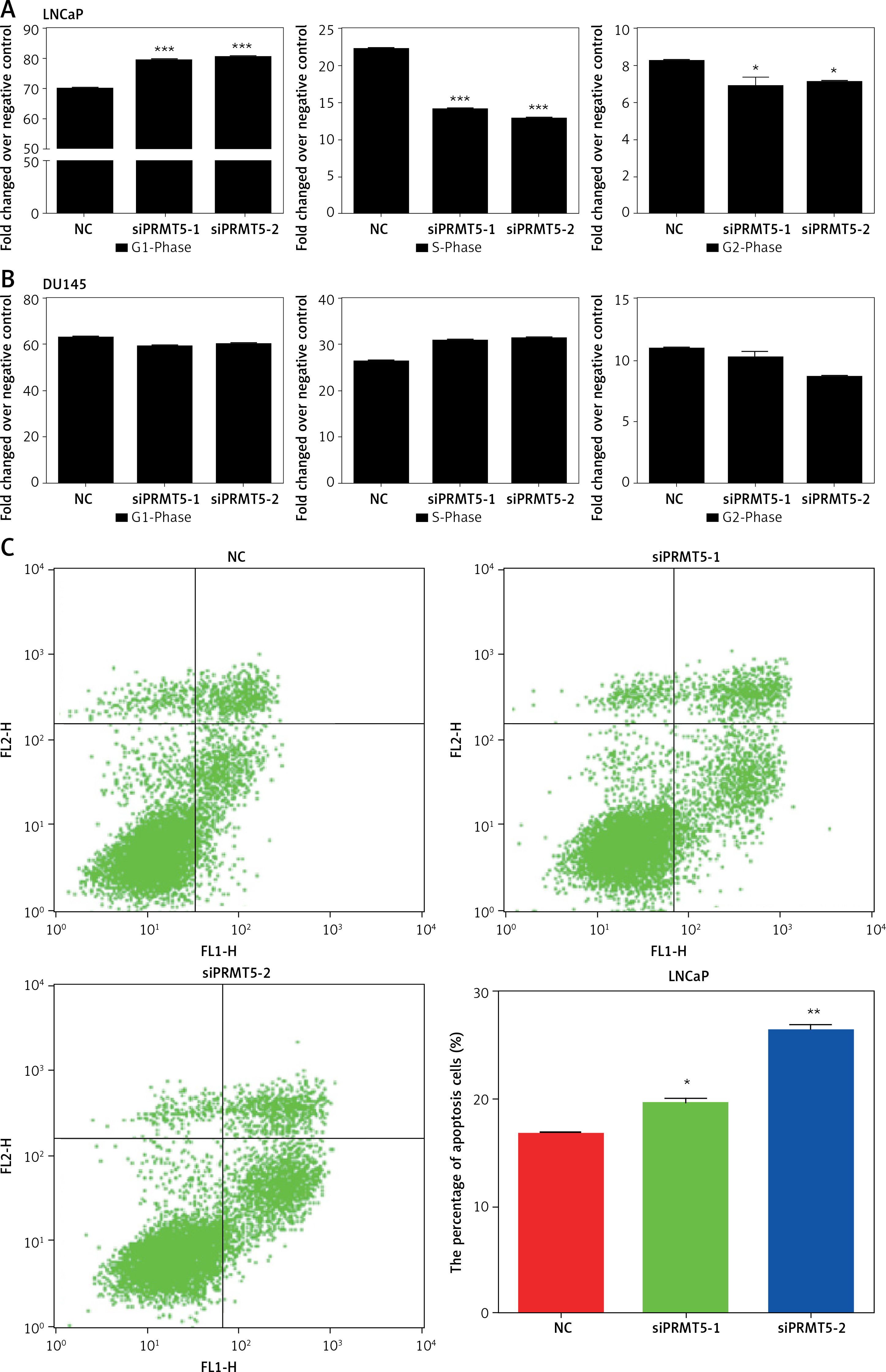 PRMT5 promotes cell cycle progression and cell apoptosis of androgen-dependent PCa, not androgen-independent PCa. A – Knockdown of PRMT5 in LNCaP cells significantly increased the percentage of G1 phase cells and reduced the percentage of S and G2/M phase cells compared to NC group (p < 0.001). B – Knockdown of PRMT5 in DU145 cells did not change the percentage of G1 phase cells and S phage cells compared to NC group. C – Knockdown of PRMT5 significantly increased the early and late apoptotic cell fractions by 18% and 37.5% in LNCaP cells, respectively D – Knockdown of PRMT5 had no effect on the androgen-independent DU145 apoptosis