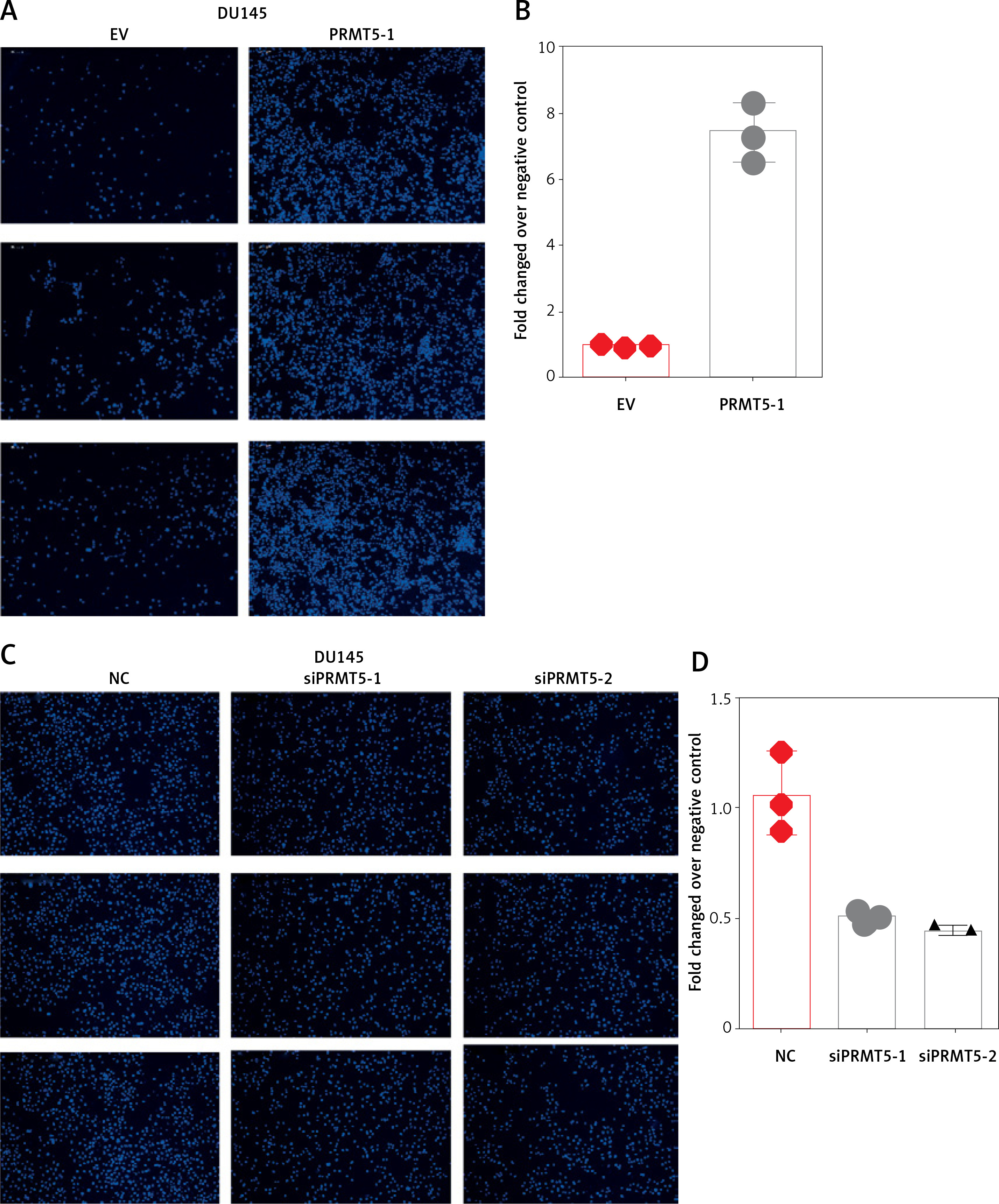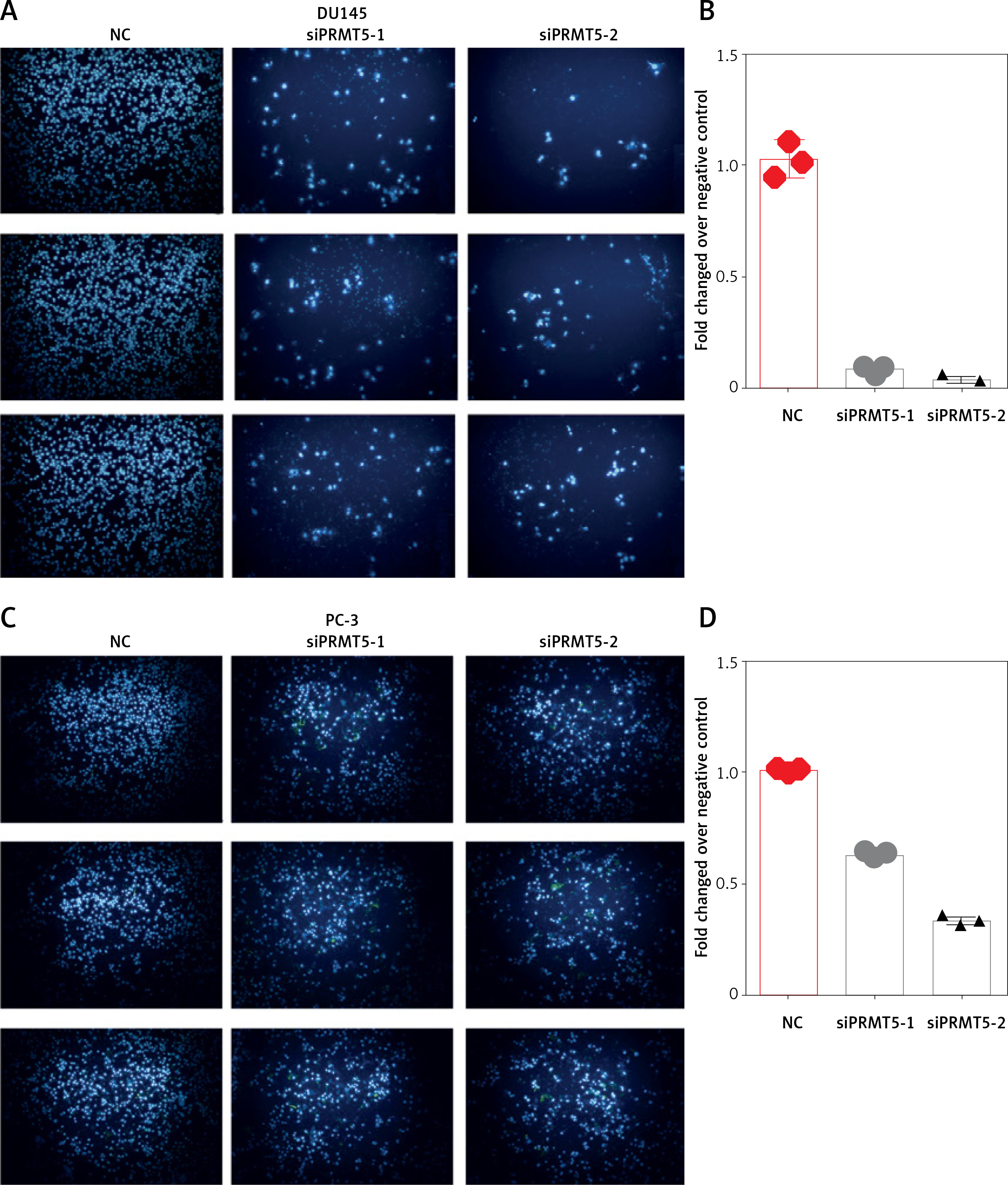 PRMT5 promotes cell invasion of androgen-independent PCa. Knockdown of PRMT5 significantly inhibited cell invasion in DU145 (A, B) and PC-3 cells (C, D)