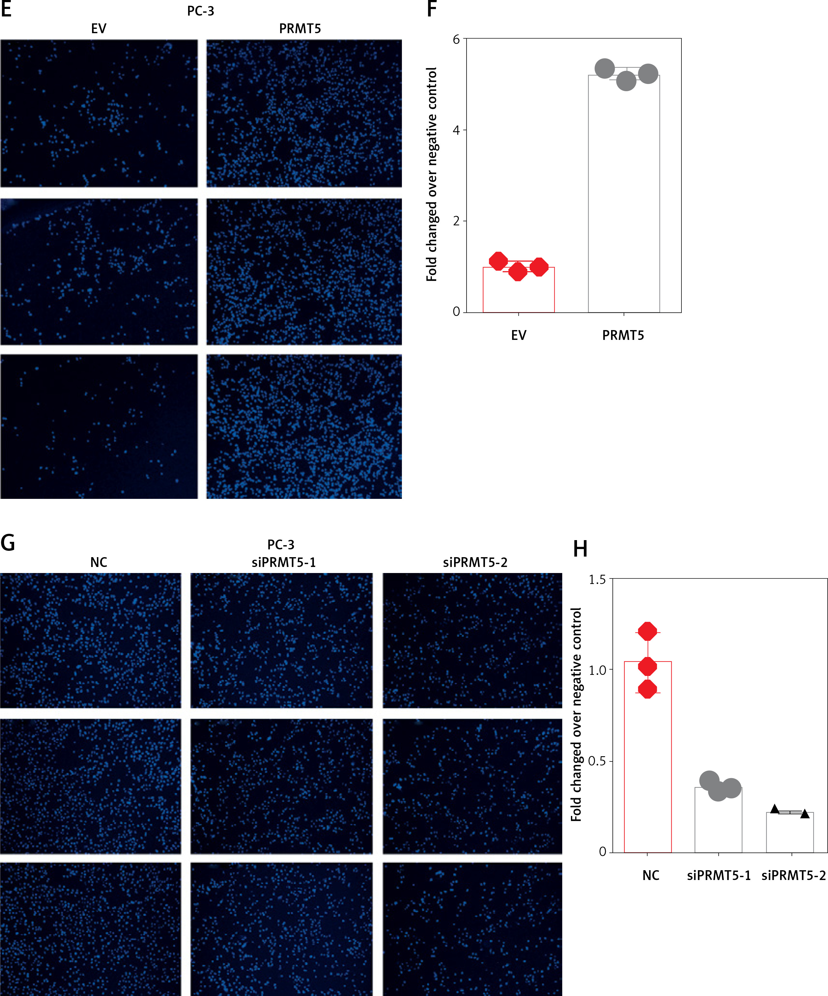 Considering that PRMT5 did not affect the proliferation of androgen-independent PCa, the present study hypothesized that PRMT5 might be involved in promoting androgen-independent PCa metastasis. First, the present study performed transwell assay to detect the effect of PRMT5 overexpression on PC-3 and DU145 cell migration. Our results showed that overexpression of PRMT5 remarkably enhanced PC-3 and DU145 cell migration ability (Figures 5 A, B, E, F). Of note, the present study found that knockdown PRMT5 significantly decreased PC-3 and DU145 cell migration ability compared to control groups in PC-3 and DU145 cells (Figures 5 C, D, G, H).