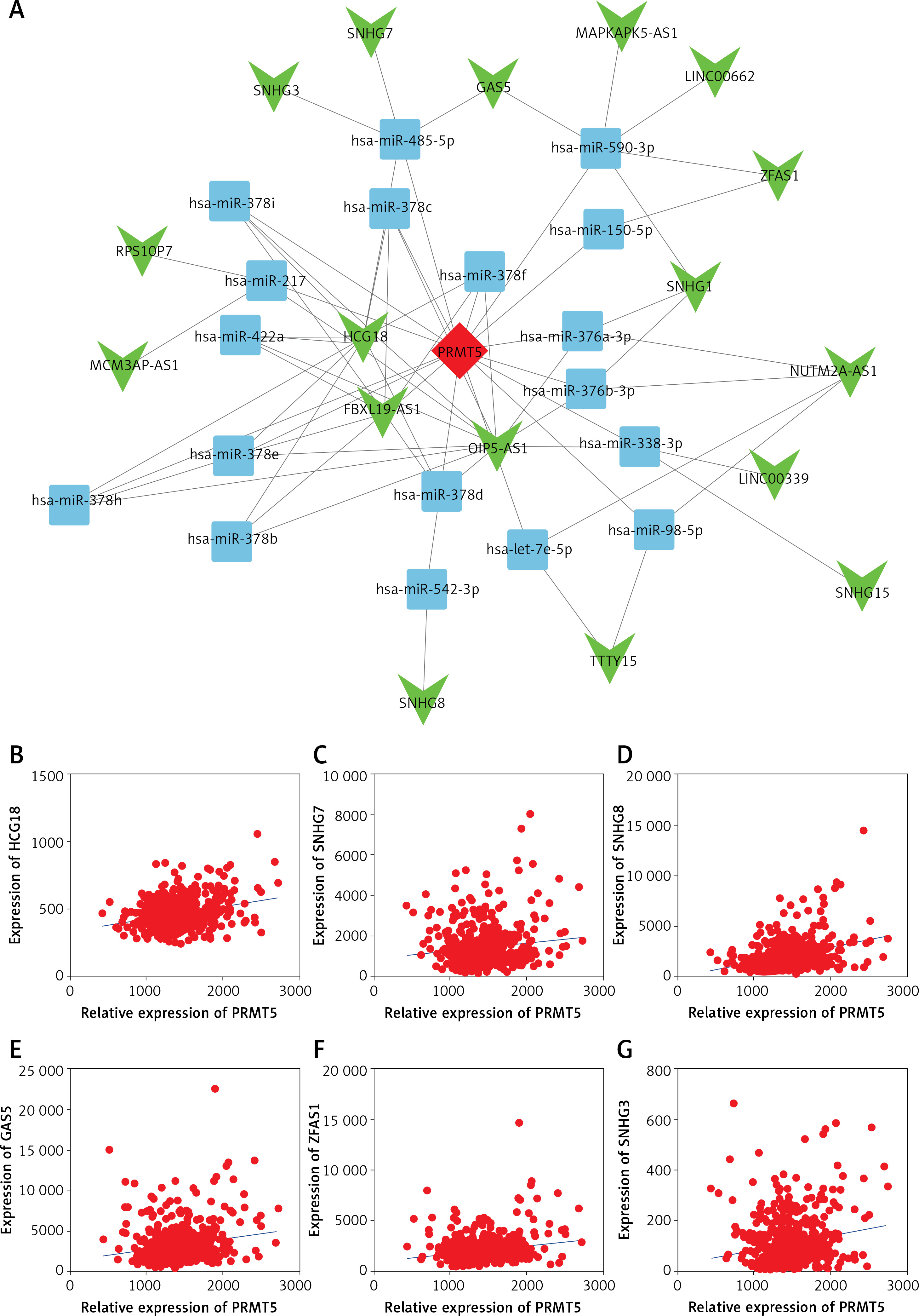 The potential competing endogenous RNA networks involved in PRMT5 regulation in PCa. A – A total of 17 lncRNAs (including GAS5, SNHG3, SNHG7, ZFAS1) and 26 miRNAs were included in this network. B–G – The most significantly co-expressing lncRNAS of PRMT5 in PCa included HCG18, SNHG7, SNHG8, GAS5, ZFAS1, and SNHG3