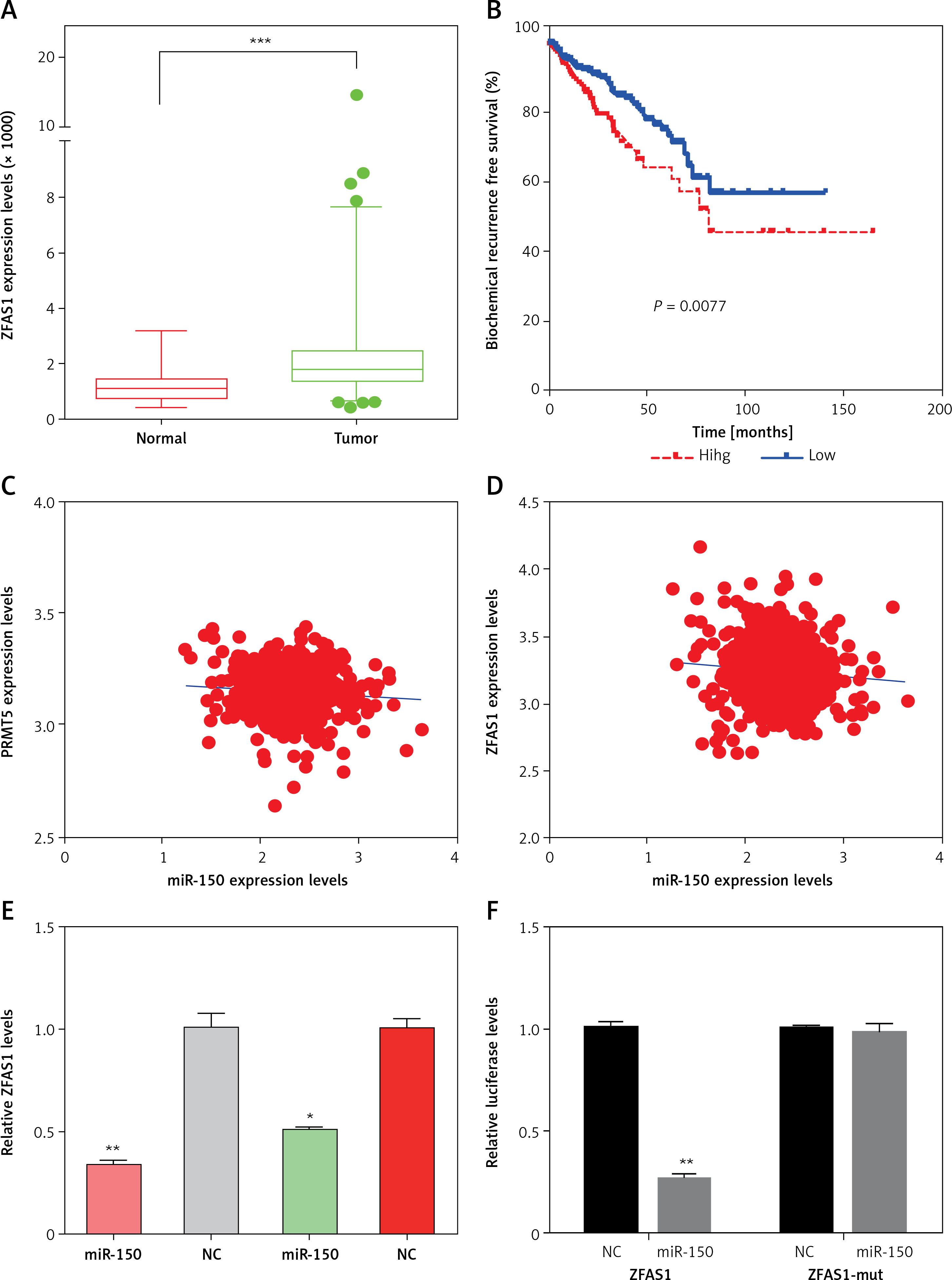 The present study focused on the ZFAS1/miR-150-5p axis in PCa. ZFAS1 and miR-150-5p had been reported to be dysregulated and involved in the regulation of human cancer progression. However, their roles in PCa remained unclear. This study for the first time showed that ZFAS1 was significantly overexpressed in PCa and correlated with shorter disease-free survival time in patients with PCa (Figures 8 A and B). Moreover, the present study found that the expression levels of miR-150-5p were negatively correlated with both ZFAS1 and PRMT5 expression levels in PCa (Figures 8 C and D). These results suggested that the FAS1/miR-150-5p axis may participate in the regulation of PRMT5 expression in PCa.