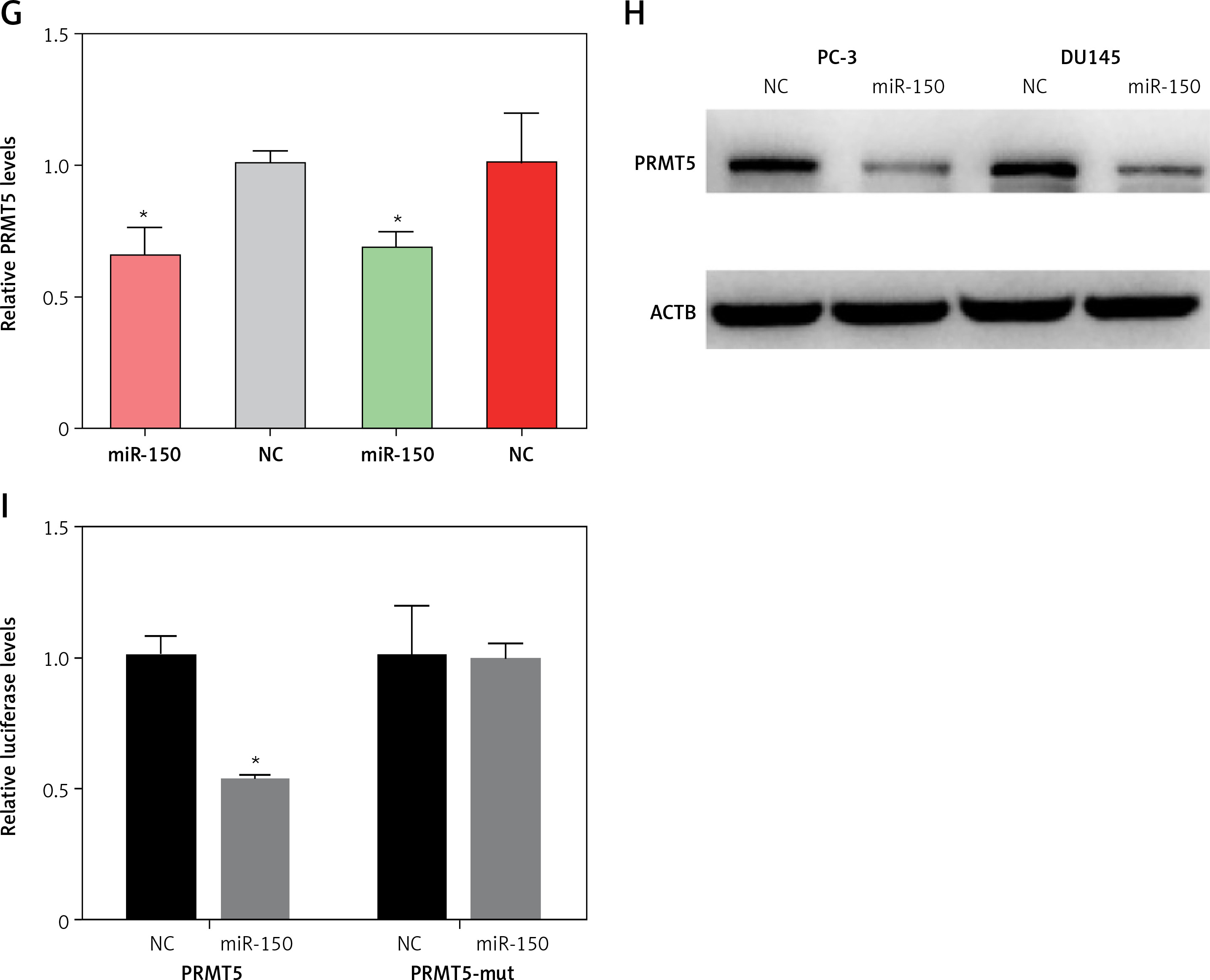 Then, the present study detected the expression levels of ZFAS1 and PRMT5 after overexpressing miR-150-5p in PC-3 and DU145 cells. As presented in Figures 8 E and G, our results showed that the RNA levels of ZFAS1 and PRMT5 were significantly reduced after overexpressing miR-150-5p in PC-3 and DU145 cells using RT-PCR assay. Western blot assay also showed that the protein levels of PRMT5 were significantly decreased in PC-3 and DU145 cells transfected with miR-150-5p compared to normal samples (Figure 8 H).