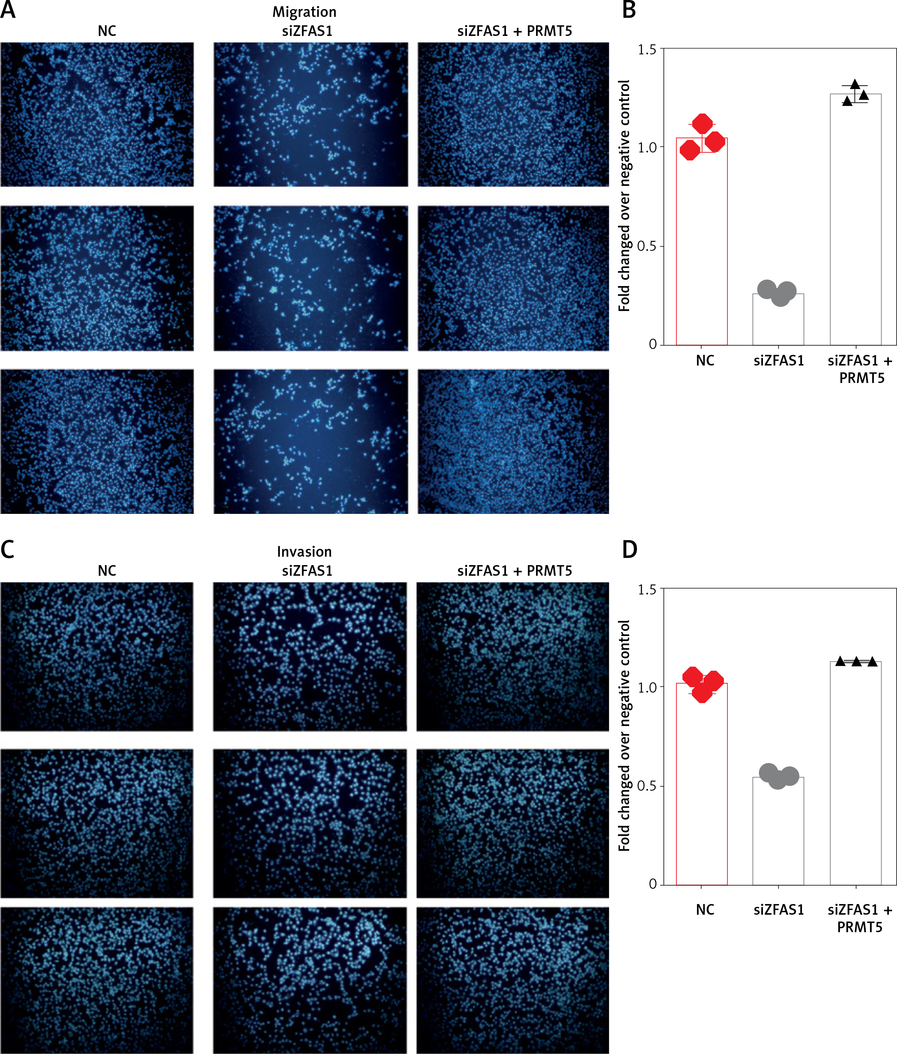 ZFAS1 promoted cell migration and invasion of PCa though PRMT5. A, B – Knockdown of ZFAS1 significantly inhibited migration of PC-3 cells compared with NC group; overexpression of PRMT5 could rescue the migration. C, D – Knockdown of ZFAS1 significantly inhibited invasion of PC-3 cells compared with NC group; overexpression of PRMT5 could rescue the invasion