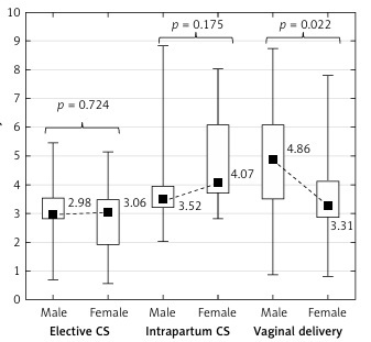 Global DNA methylation in the placenta in elective caesarean sections (3.02 on average) was significantly lower compared to intrapartum caesarean sections (3.71 on average) and vaginal deliveries (3.64 on average), but did not significantly differ between intrapartum caesarean sections and vaginal deliveries. Global DNA methylation in the placenta in male newborns was significantly higher (4.86 on average) than in female newborns (3.31 on average) in vaginal deliveries but not in either elective or intrapartum caesarean sections.