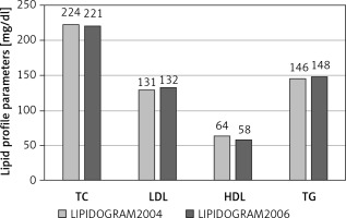 Significant prevalence of lipid disorders, estimated according to the US NCEP-ATP III (National Cholesterol Education Program – Adult Treatment Panel III) guidelines, was also observed in the nationwide studies LIPIDOGRAM2003, LIPIDOGRAM2004 and LIPIDOGRAM2006, in which a total number of nearly 49,000 primary health care (PHC) patients were eventually included in the databases (including LIPIDOGRAM 2015) [18–20]. In the LIPIDOGRAM2003 study, the mean values of lipid profile parameters were: total cholesterol (TC) – 228 mg/dl (5.9 mmol/l), LDL-C – 140 mg/dl (3.6 mmol/l), HDL-C – 57 mg/dl (1.5 mmol/l), and TG – 156 mg/dl (1.8 mmol/l) [18]. Hypercholesterolaemia > 200 mg/dl (> 5.2 mmol/l) was reported in 72% of the subjects, more often in women than in men (76% vs. 67%). Elevated LDL-C concentration (according to the normal values accepted at the time) of > 160 mg/dl (4.1 mmol/l) occurred in 28% of the enrolled subjects, more often in women than in men (30% vs. 24%). Decreased HDL-C concentration < 40 mg/dl (1.0 mmol/l) was observed in 6% of the subjects, 12% and 3% in men and women, respectively, while elevated TG levels > 200 mg/dl (2.3 mmol/l) were observed in 22% of the subjects, more often in men than in women (26% vs. 19%) [18]. Mean values of specific lipid profile parameters and the percentage of abnormal values in subsequent studies – LIPIDOGRAM2004 [19] and LIPIDOGRAM2006 [20] – are presented in Figure 1.