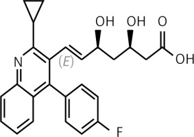 The SCEAD study by Tarim et al., involving 180 patients with dyslipidaemia and type 2 diabetes, assessed the effects of pitavastatin, rosuvastatin and atorvastatin on the metabolic profile. Patients were randomised to pitavastatin 2 mg (n = 42), rosuvastatin 10 mg (n = 45) or atorvastatin 20 mg (n = 44) daily for 6 months. It was shown that the lipid-lowering potency of pitavastatin (reduction in serum concentrations of total cholesterol, LDL-C, and triglycerides) was not significantly different from rosuvastatin or atorvastatin. The increase in serum HDL-C was only significant in patients taking pitavastatin [60]. A randomised study by Hong et al. involving 1,101 post-ACS patients evaluated the effect of pitavastatin 2 mg or 4 mg/day for 12 months. It showed that pitavastatin 2 or 4 mg significantly reduced serum total cholesterol (43–55%) and LDL-C (34–42%) [61]. A RCT involving 106 children and adolescents with hypercholesterolaemia showed that the use of pitavastatin (1, 2 or 4 mg/day) for 52 weeks versus placebo was associated with a reduction in serum LDL-C of nearly 40% and was well tolerated [62]. The association of pitavastatin with ezetimibe is also beneficial. In a randomised trial by Jeong et al. involving 283 patients with lipid disorders, pitavastatin 2 mg + ezetimibe 10 mg/day or pitavastatin 2 mg/day or pitavastatin 4 mg/day + ezetimibe 10 mg/day were used for 8 weeks. The use of the combination of pitavastatin and ezetimibe was shown to reduce serum LDL-C by 52.8% (±11.2%), while pitavastatin alone reduced serum LDL-C by 37.1% (±14.1%) [63]. Another study involving 880 post-ACS patients using pitavastatin versus pitavastatin + ezetimibe for 3.4 years also showed a significantly stronger lipid-lowering effect of combination therapy for both LDL-C (66.4 ±21.7 vs. 85.1 ±23.1 mg/dl), total cholesterol (141 ±26 vs. 162 ±30 mg/dl) and triglycerides (134 ±76.7 vs. 155 ±98.1 mg/dl) [64]. The highly beneficial lipid-lowering effect of combining pitavastatin with ezetimibe was also confirmed in a meta-analysis of 9 RCTs in a group of 2,586 patients with CAD. It found that pitavastatin in combination with ezetimibe resulted in significantly greater reductions in serum LDL-C (SMD = –0.86; 95% CI: –1.15 to –0.58), total cholesterol –0.84; –1.10 to –0.59) and triglycerides (−0.59; –0.89 to –0.28) compared with pitavastatin monotherapy [65]. In a randomised clinical trial by Ihm et al., the effect of combination therapy with pitavastatin (2 mg/day) + fenofibrate (160 mg/day) vs. pitavastatin monotherapy (2 mg/day) was assessed in 347 patients with mixed dyslipidaemia. After 8 weeks of treatment, it was found that combination therapy was associated with greater reductions in serum non-HDL-C and LDL-C and increases in serum HDL-C (by –7.4%, –7.7% and +20.7%, respectively). Monotherapy and combination therapy were safe and well tolerated by patients [66]. It is worth noting that pitavastatin also improves the LDL-C subfraction profile, as it reduces the percentage of small LDL and oxidised LDL (oxLDL) [67].