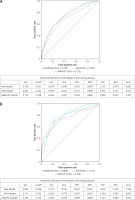In the training cohort, the ROC analysis and the multiple logistic regression of the new model, SOFA model and APACHE II model showed that the corresponding areas under the curve (AUCs) were 0.749 (95% CI: 0.7235–0.77740), 0.687 (95% CI: 0.6585–0.7157), and 0.732 (95% CI: 0.7062–0.7586), respectively (Figure 3 A). Among the AUCs of the three models, the AUC of the new model was higher than that of the SOFA model (p < 0.001) and the APACHE II model (p = 0.292), and the relative optimal cutoff point was 0.190, corresponding to a sensitivity of 0.676 and a specificity of 0.689. Compared with the new model, the SOFA model’s sensitivity and specificity were both lower. Although the APACHE II model’s specificity was higher than that of the new model, its sensitivity was much lower than that of the new model and was just 0.569.