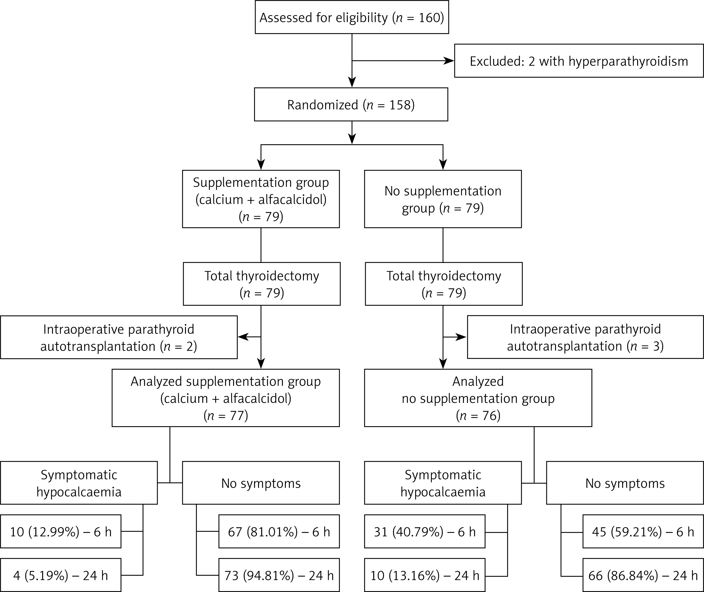 That might increase patients’ safety and satisfaction. Despite the use of supplementation, thyroidectomised patients should be carefully monitored for the development of symptomatic hypocalcaemia. The use of only preoperative supplementation does not exempt clinicians from performing laboratory tests for calcium and iPTH in the postoperative period. Preoperative supplementation does not prevent hypocalcaemia in all patients. The main disadvantage of the study was short-term calcium and alfacalcidol supplementation prior to surgery. It resulted from the fact that in our department, surgeons do not prepare all patients themselves for surgery. It was a factor impossible to circumvent during the course of the study.