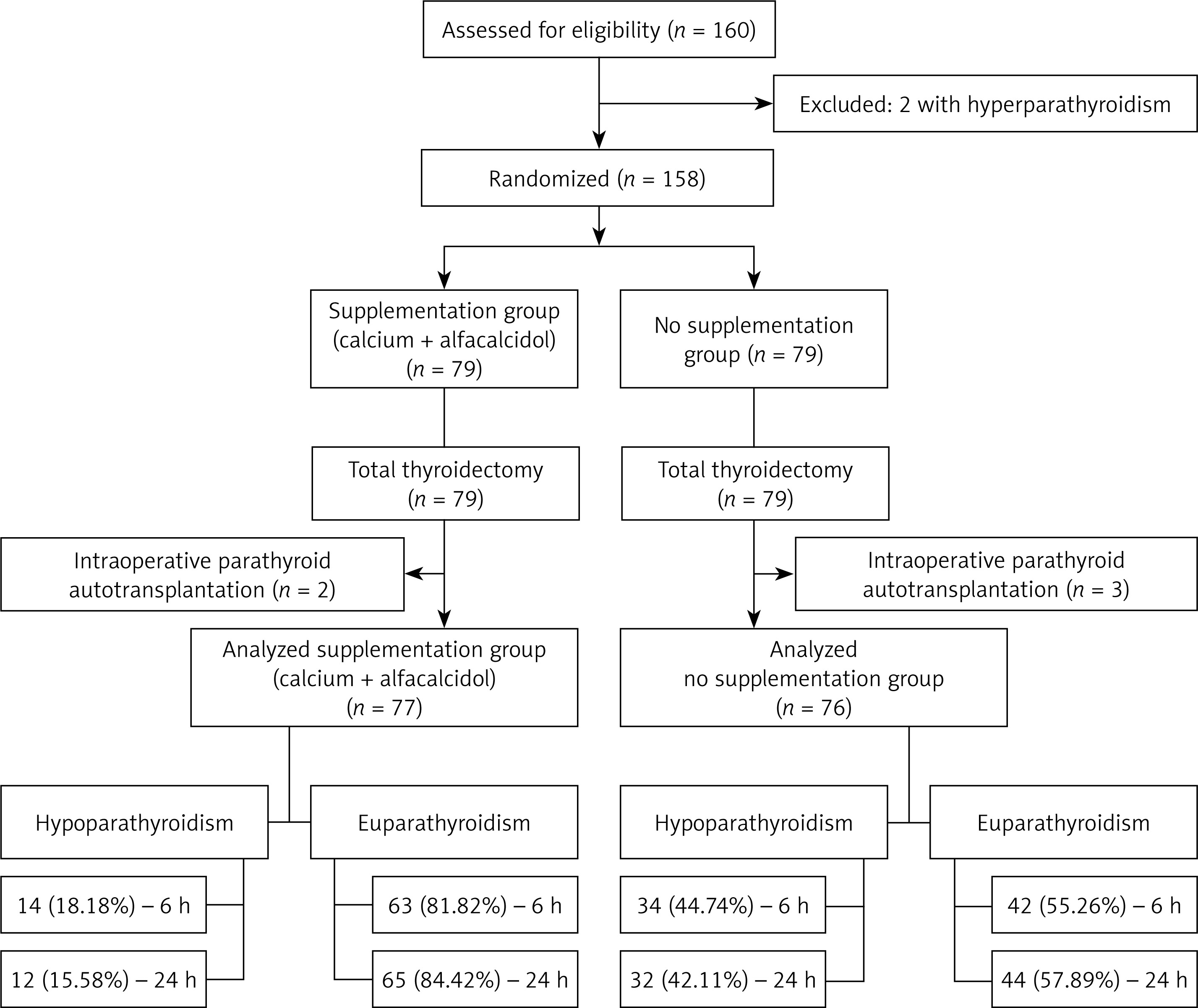 The authors did not focus on a thorough analysis of laboratory assays (parathormone and calcium levels) or hypocalcaemic symptoms. Inactivated forms of vitamin D, used in the study with long time to onset of action, are unlikely to be beneficial in 24-hour preoperative supplementation [20]. In another retrospective study, perioperative calcium and calcitriol supplementation reduced laboratory and symptomatic hypocalcaemia more effectively than the postoperative supplementation [17]. However, only the efficacy of perioperative supplementation was evaluated in that study. The group of enrolled patients was not homogeneous – some of them had carcinoma and they additionally underwent lymphadenectomy.