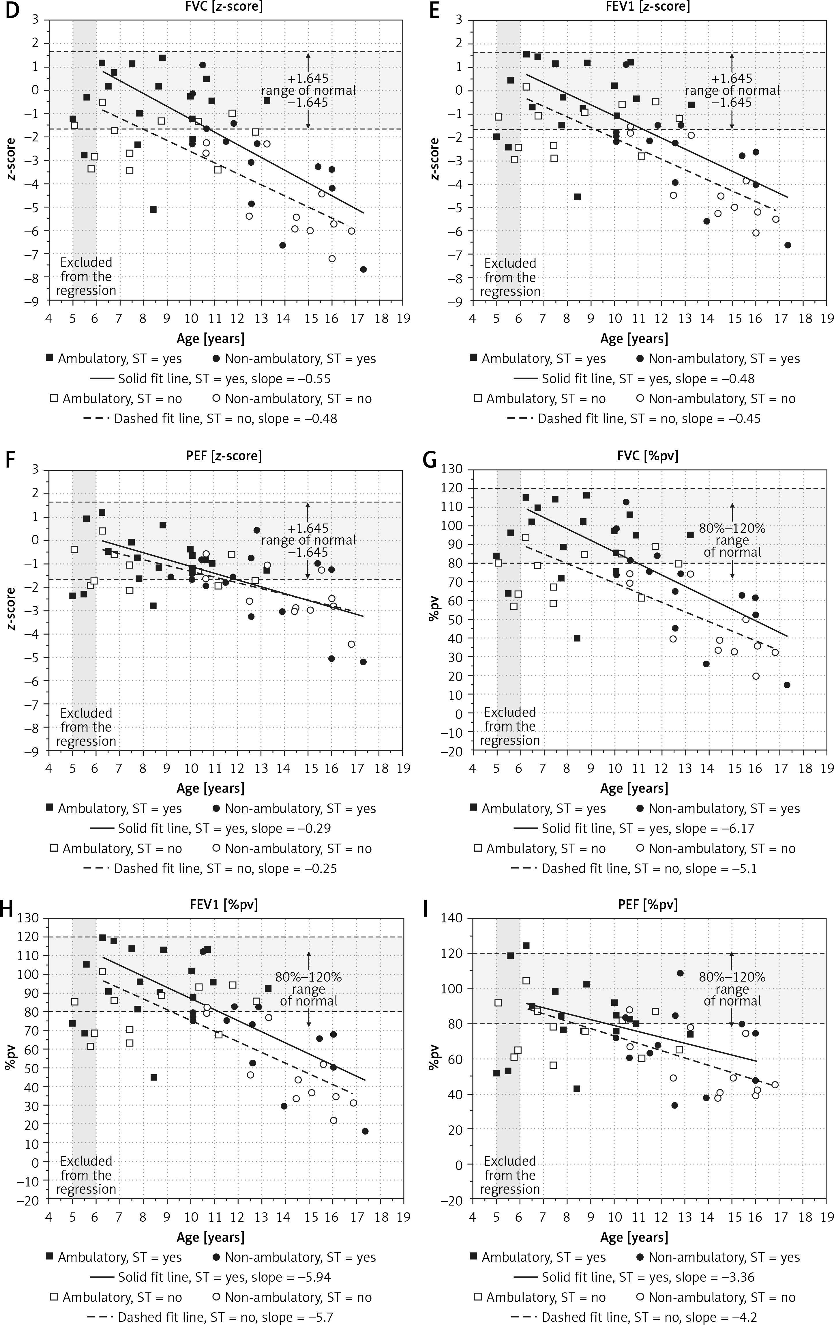 However, the regression lines are shifted and intersect the threshold for a lower level of normal (z-score < –1.64) at different ages for on-ST vs. non-ST patients: FVC (10.7 vs. 7.9), FEV1 (11.2 vs. 9.2 years of age respectively). This could be interpreted as 3 years of advantage for FVC and 2 years of advantage for FEV1 of the treated vs untreated patients. The results presented as %pv showed slower progression with steroid treatment, and the regression lines shifted the threshold for a lower level of normal (< 80%pv) later than presented in the z-score (on-ST vs. non -ST patients: FVC 11.0 vs. 8.1, FEV1 11.5 vs. 9.6 years of age respectively, Figures 1 G–I).