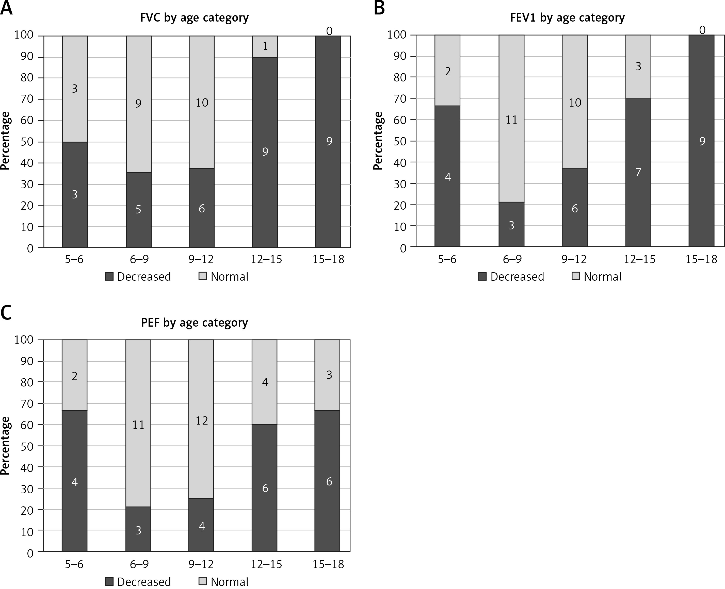 All children older than 14.0 years had abnormal PFT with significant variability in the results. Interestingly, absolute FVC ranged from 0.6 l to 2.5 l (3 patients presented FVC under 1 l) (Figures 1 D, E).