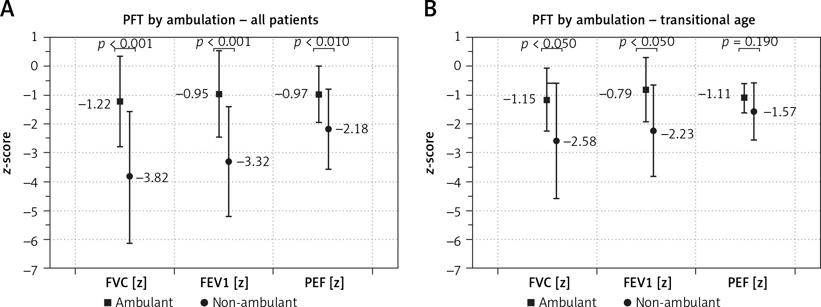 Patients who were able to walk on their own had significantly higher PFT results than non-ambulatory patients (Figure 3 A). The ambulatory transitional period is established between 10 and 14 years of age (n = 24). In our study group 10 (42%) patients in this period were ambulant. Ambulatory patients in transitional age had significantly higher FVC[z] and FEV1[z] (p < 0.05 for both variables), but not PEF[z] (p = 0.190), in comparison to the non-ambulatory patients (Figure 3 B). Similar results were obtained for FVC %pv, FEV1 %pv, PEF %pv: 87.3 vs. 57.7; 94.5 vs. 63.6 and 79.7 vs. 60.7, respectively (p = 0.0001).