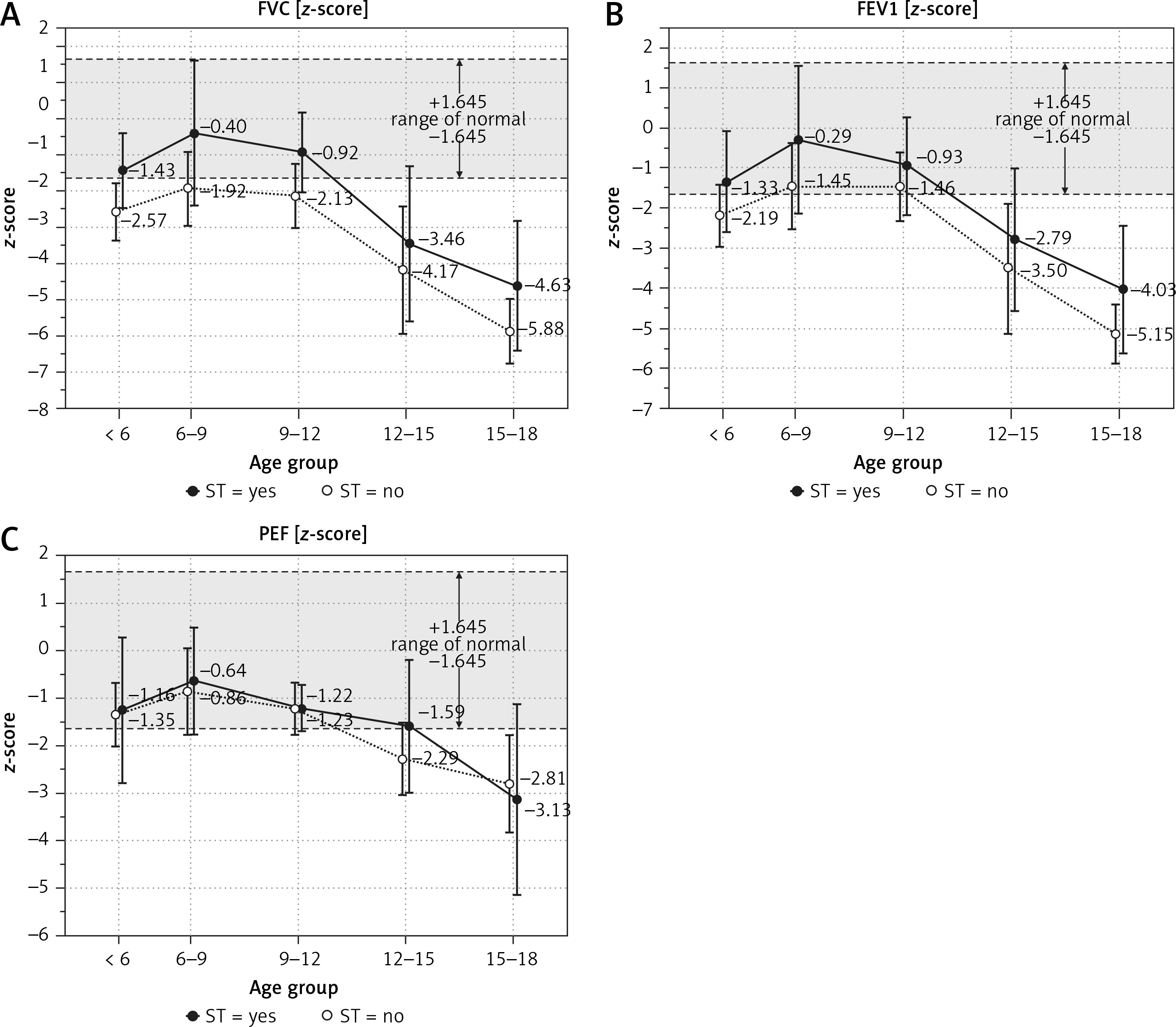 Patients treated with steroid therapy (on-ST) presented significantly higher values of FVC %pv (81.1 ±27.1 vs. 61.1 ± 22.2, p = 0.002), FEV1 %pv (87.1 ±27.8 vs. 69.1 ±25.1, p = 0.02), PEF %pv (74.5 ±21.8 vs. 65.1 ±20.1, p = 0.11) and also FVC[z] (–1.7 ±2.3 vs. –3.4 ±2.0, p = 0.005), FEV1[z] (–1.5 ±2.0 vs. –2.8 ±1.9, p = 0.016), but not PEF[z] (–1.4 ±1.4 vs. –1.8 ±1.1, p = 0.257), than patients without steroid therapy (non-ST). This difference did not reach statistical significance within age subgroups (Figures 4 A–C), probably as a result of small sample sizes.