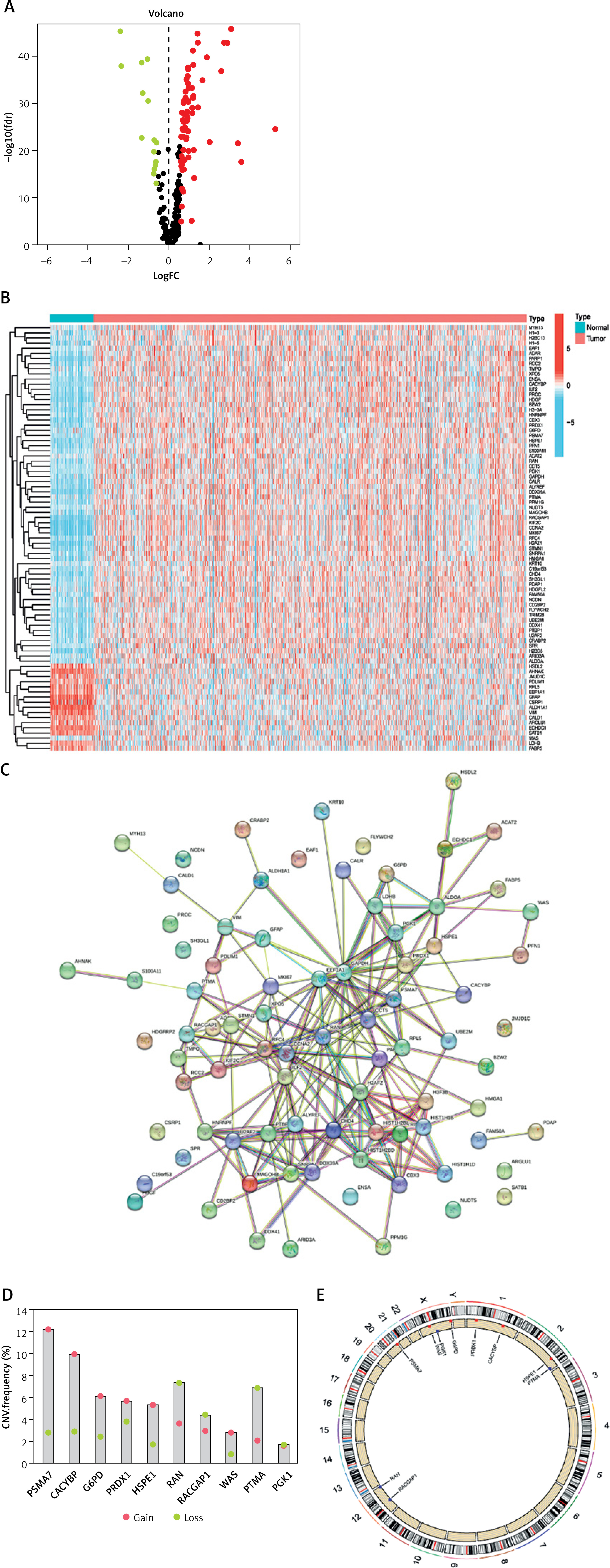 Lactylation-related gene expression and mutation in breast cancer. A – Difference analysis of gene expression in breast cancer. B – Differential expression of lactylation-related genes in breast cancer. C – PPI network of lactylation-related genes. D – Frequency of copy number variation of lactylation-related genes. E – Chromosomal distribution circle diagram of lactylation-related genes