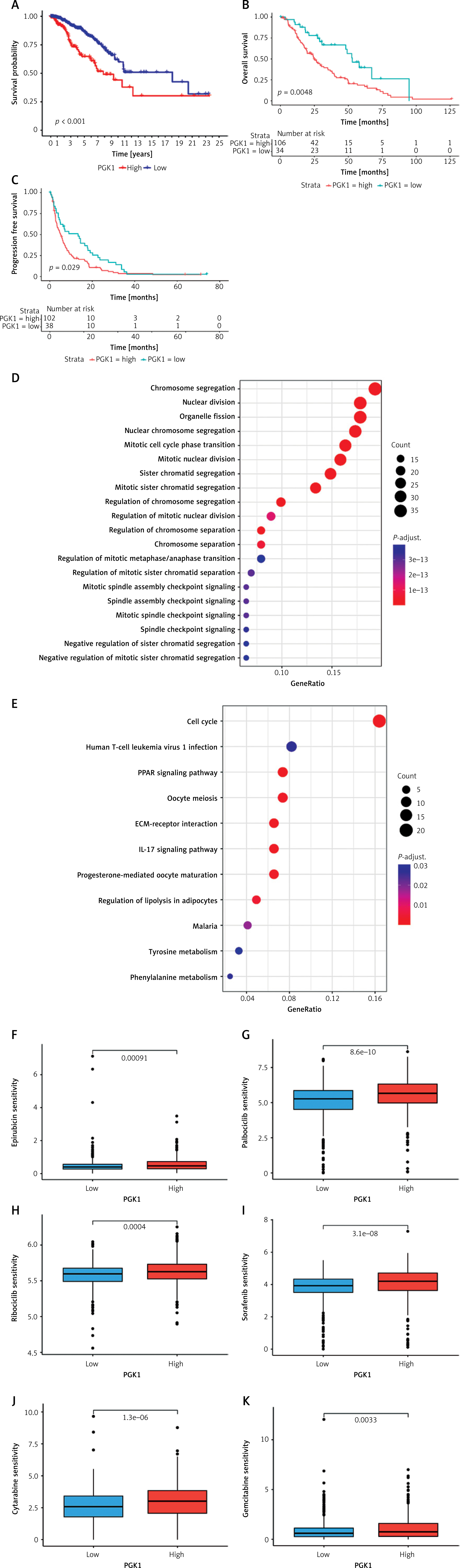 Prognostic analysis, biological function, and drug sensitivity analysis of PGK1. A – Survival curves of PGK1. B, C – Differences in OS and PFS among patients with varying levels of PGK1 expression in the GSE124647 dataset. D – GO/KEGG analysis of biological functions and signaling pathways of differentially expressed genes between the high PGK1 group and low PGK1 group. E – GO/KEGG analysis of biological functions and signaling pathways of differentially expressed genes between the high PGK1 group and low PGK1 group. F–I – Comparison of the IC50 values of common antitumor drugs between the high PGK1 group and low PGK1 group, including epirubicin, palbociclib, ribociclib, sorafenib, cytarabine, gemcitabine J–K – Comparison of the IC50 values of common antitumor drugs between the high PGK1 group and low PGK1 group, including epirubicin, palbociclib, ribociclib, sorafenib, cytarabine, gemcitabine