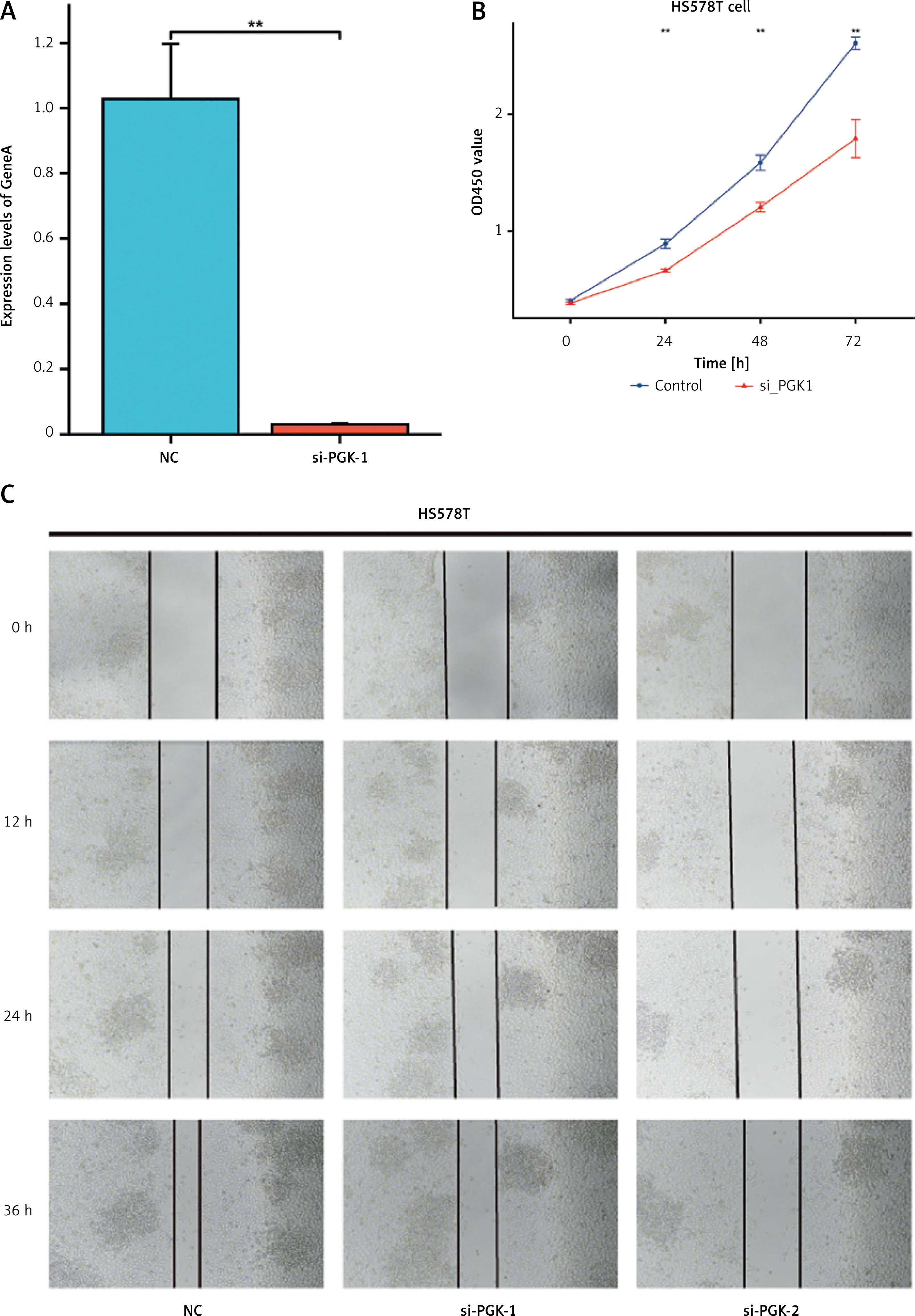We employed the quantitative RT-PCR method to assess the knockdown efficiency of PGK1 siRNA in HS578T breast cancer cells. Twenty-four hours after transfection, we examined the expression levels of PGK1 mRNA (Figure 6 A) and found a significant decrease induced by the siRNA sequences (p < 0.01). Subsequently, CCK8 analysis revealed a notable reduction in cell viability following PGK1 gene knockdown (Figure 6 B). Finally, a scratch assay was conducted to assess the impact of PGK1 knockdown on the migration capability of HS578T cells. The results indicated a significantly slower scratch closure in the PGK1 knockdown group compared to the siRNA negative control (NC) group (Figure 6 C), suggesting that PGK1 knockdown may be an effective strategy to inhibit breast cancer cell proliferation and migration.