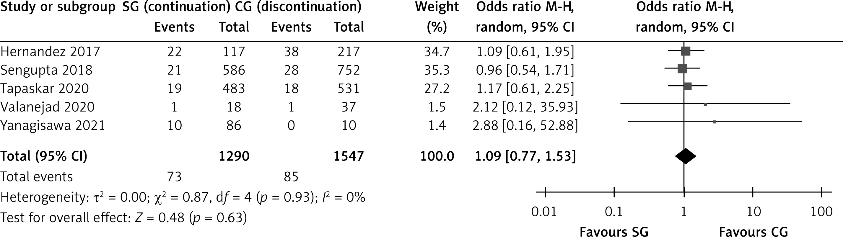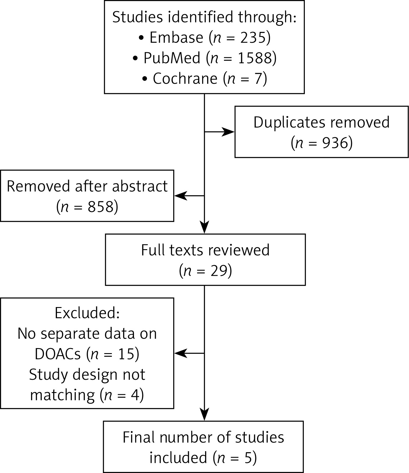Five studies [29–33] containing data comparing clinical outcomes between patients who withheld or resumed DOACs after GI bleeding were included (Table I). The initial search found 1823 studies. After excluding duplicates and unrelated studies based on abstract triage, 29 full texts were assessed for eligibility, out of which five matched the inclusion criteria and were systematically reviewed (Figure 1). The year of publication of included studies ranged from 2017 to 2021. All studies were retrospective with a case control design. The total number of patients included was 2837, split into two groups: the study group (SG, n = 1290) and the control group (CG, n = 1547). In the study group, patients were restarted on a DOAC after their GIB episode has resolved. In the control group, anticoagulation was stopped after the index GIB episode. Patients in the CG did not receive an alternative anticoagulant/antiplatelet treatment. Baseline characteristics were provided in 2 (Sengupta et al. and Valanejad et al.) out of the 5 studies included. Patients in the CG had similar associated comorbidities as the SG, with coronary artery disease and diabetes mellitus being the most frequent ones. More patients in the CG required blood transfusion and ICU admission. Lower GIB was the most frequent site of bleeding. Rivaroxaban was the main DOAC used in most cohorts, followed by dabigatran (Table I). The mean age in the SG was 77.2 vs 77.9 in the CG. Mean follow-up period ranged from 3 to 13.2 months (Table II).