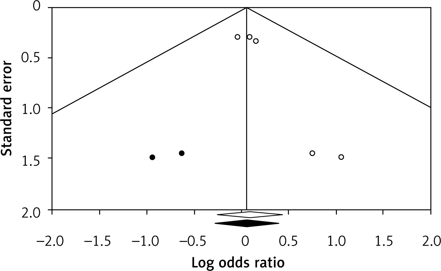 Trim and fill method to address publication bias by imputing two small studies. The funnel plot displays a measure of study size (usually standard error or precision) on the vertical axis as a function of effect size on the horizontal axis. Large studies appear toward the top of the graph and tend to cluster near the mean effect size. Smaller studies appear toward the bottom of the graph. Through the trim and fill method, two studies were imputed to adjust for publication bias (full black circles). On the bottom of the graph, the empty diamond shows the OR and confidence interval for the original studies, while the full diamond shows the OR and confidence interval for the original and imputed studies