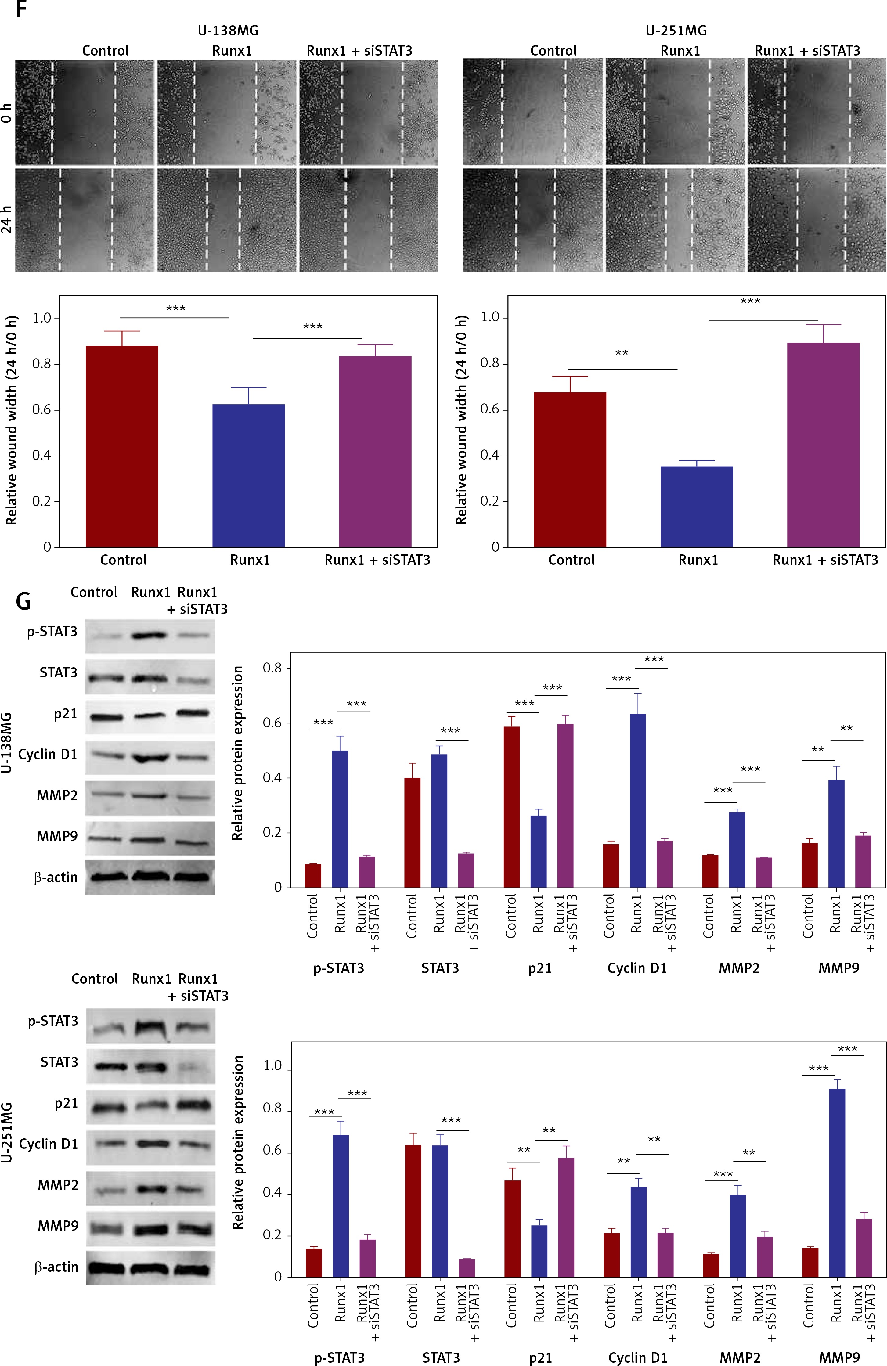 Subsequently, we constructed siSTAT3-1# and siSTAT3-2# plasmids for the STAT3 downregulation, and siSTAT3-2# was chosen in the following experiments because it was more effective at knocking down STAT3 expression (Figures 5 A, B). We examined the effect of downregulation of STAT3 on the viability and migration of glioma cells. Our results indicated that cell viability and colony formation of glioma cells were facilitated in cells transfected with Runx1 plasmid alone, while this effect was reversed owing to co-transfection with siSTAT3 plasmid (Figures 5 C, D). Similarly, the impact of STAT3 knockdown on glioma cell migration and invasion was determined by wound-healing and transwell assay. Glioma cells with Runx1 overexpression showed obviously increased migration and invasive ability. However, STAT3 knockdown reversed this consequence (Figures 5 E, F). Furthermore, Western blot results showed that the increases of p-STAT3, cyclin D1, MMP 2, and MMP 9 and the decrease of p21 induced by Runx1 overexpression were attenuated by STAT3 knockdown (Figure 5 G). Thus, the effect of Runx1 on the promotion of glioma cell viability and migration was abolished when STAT3 was downregulated. Our results suggested that Runx1 promotes viability and migration of glioma cells via JAK-STAT signalling pathway activation.