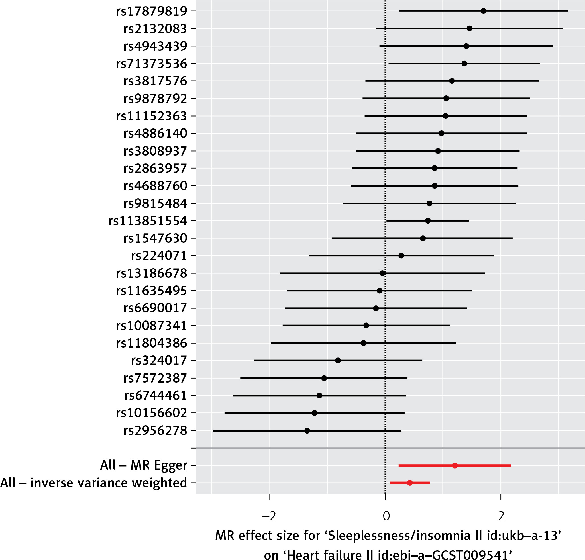 25 SNPs identified in sleeplessness GWASs were chosen as IVs. These SNPs are listed in Supplementary Table SII and Figure 2. They exhibit genome-wide significant associations with sleeplessness (Supplementary Table SII). All of these SNPs showed positive associations with HF (Supplementary Table SII).