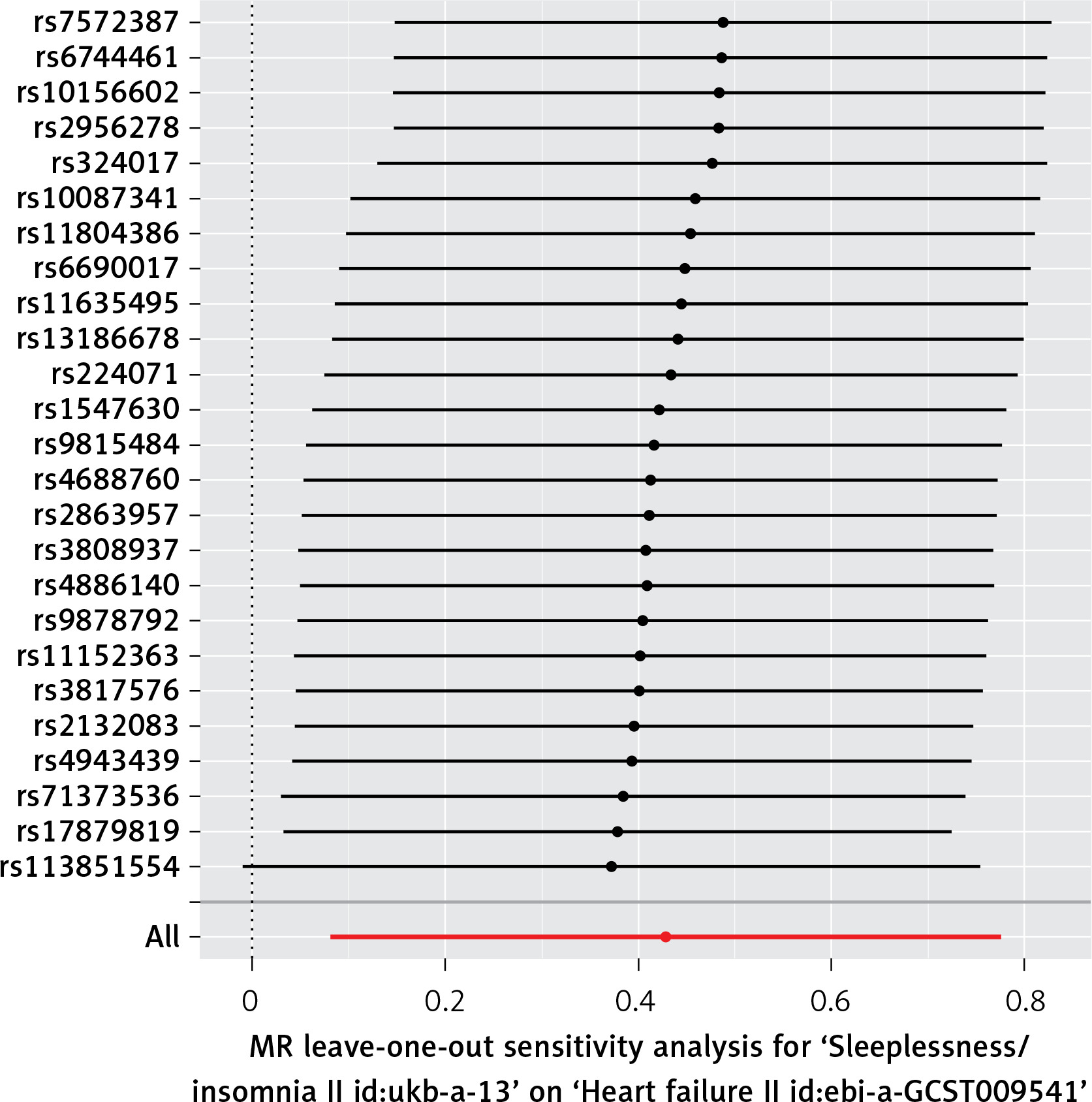 The Cochran Q-test derived P-values for MR-Egger methods indicated no heterogeneity (Q = 32.63; p = 0.087), and in the absence of a significant intercept, no directional pleiotropy was observed (Supplementary Figure S2). Results from a leave-one-out analysis demonstrated that only one single SNP (rs113851554) did not strongly violate the overall effect of sleeplessness on HF, while other single SNPs strongly violated the overall effect of sleeplessness on HF (Figure 4).