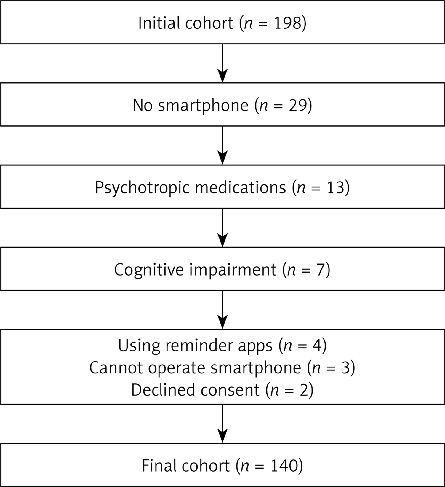 Exclusion criteria included individuals under 18 years, those declining informed consent, non-smartphone users or those unable to operate a smartphone independently, patients with cognitive impairments or mental health conditions preventing questionnaire completion, current use of medication reminder apps, and individuals prescribed psychotropic medications, including but not limited to antidepressants, antipsychotics, benzodiazepines, or mood stabilizers, which may affect cognitive function. The recruitment process is presented in a flowchart (Figure 1).