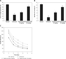 Neurological dysfunction was assessed by determining the neurological score in anaesthesia-induced neuronal injury rats (Figure 2). The neurological score was significantly (p < 0.01) higher in the isoflurane-treated group than in the normal rats. A dose-dependent reduction was observed in the sophoricoside-treated groups compared to the isoflurane-treated group.