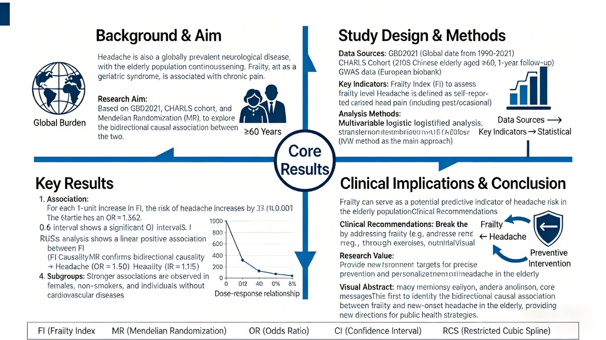 The growing global burden of headaches, especially in older adults, underscores the urgency of targeted interventions. Our findings imply that frailty may be a potential indicator of headache risk, and they call for healthcare strategies to reduce the incidence of headache by intervening in frailty. In the future, we will focus on the biological processes underlying the frailty-headache association to provide credible targets for personalized treatment and evidence-based preventive care.