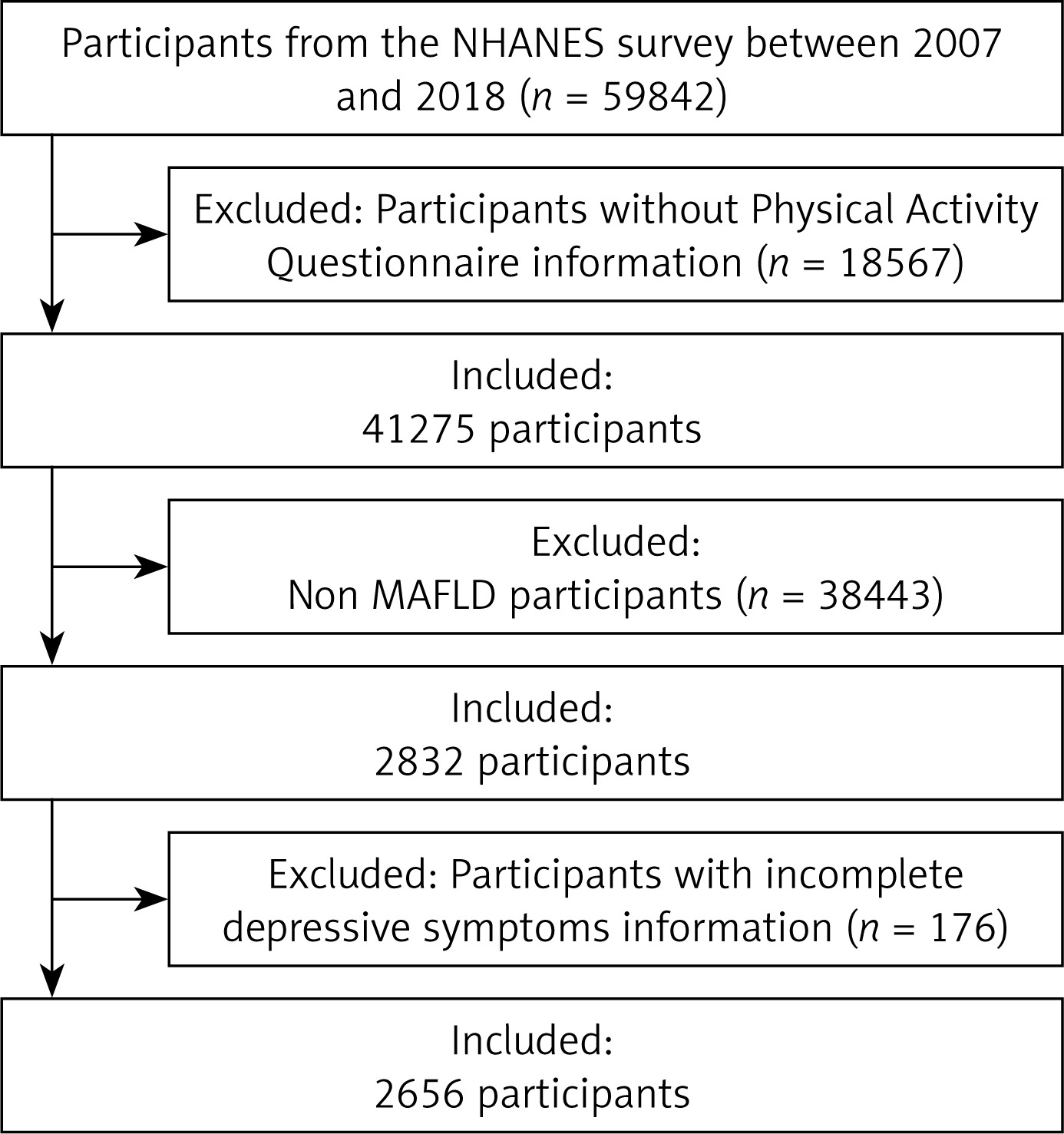 In order to fill these gaps in our understanding, this research analysed the relationship between the kinds and amounts of physical exercise and the risk of depressive symptoms in people with MAFLD. Our goal was to help MAFLD patients improve their physical and mental health by gaining a better knowledge of the correlation between their level of physical activity and their feelings of depression. In addition, this research may add to our general knowledge of how exercise might help with the treatment of long-term health conditions and the psychological issues that often accompany them.