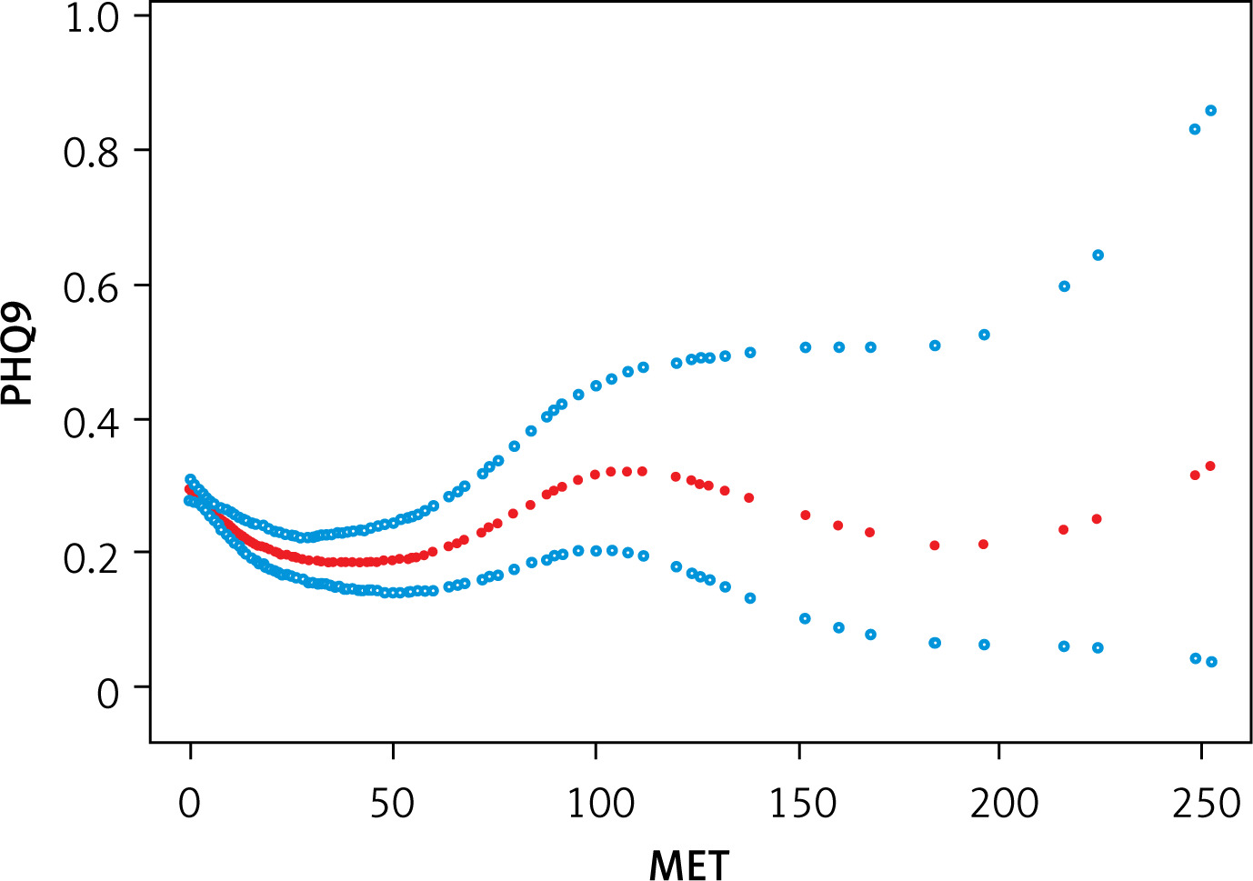 Note: A solid rad line represents the smooth curve fit between variables. Blue bands represent the 95% of confidence interval from the fit. All variables were adjusted for age, gender, race, body mass index, smoking status and family PIR.