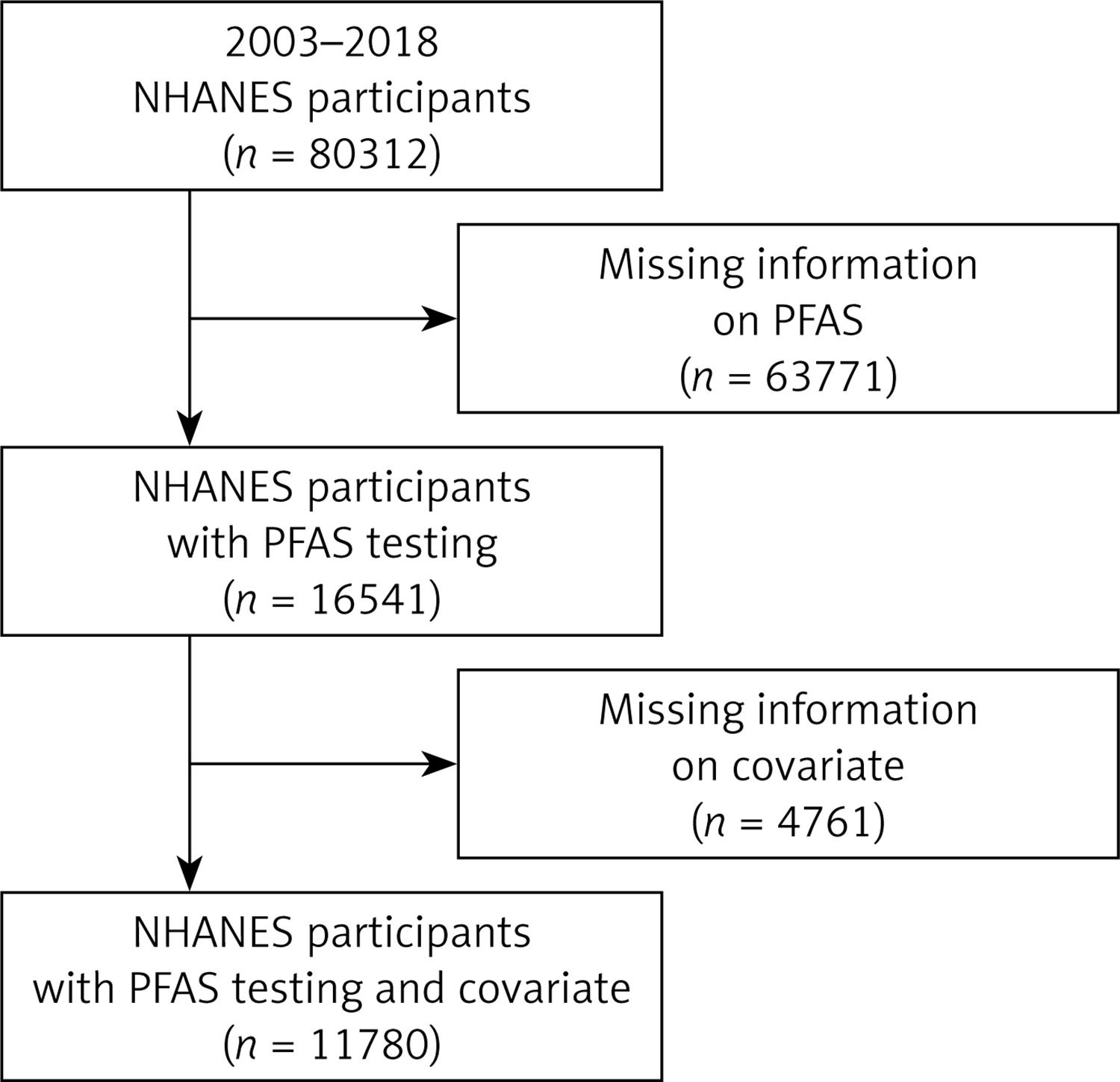 The NHANES is a cross-sectional study conducted in the United States since the 1960s to assess the health and nutritional status of individuals, including children and adults. Approval was obtained from the Ethical Review Board of the National Center for Health Statistics, and informed consent was secured from all participants. Data from publicly available sources, spanning from 2003 to 2018, were collected for this study. A total of 80,312 participants were initially included, with 63,771 excluded due to missing PFAS level information. Of the remaining 16,541 participants with PFAS measurements, 4,761 were further excluded for missing covariates. Fortunately, no outcome variables were missing. Ultimately, 11,780 participants were included in the final analysis, all of whom had complete information on both PFAS measurements and covariates. Further details on participant identification can be found in Figure 1.