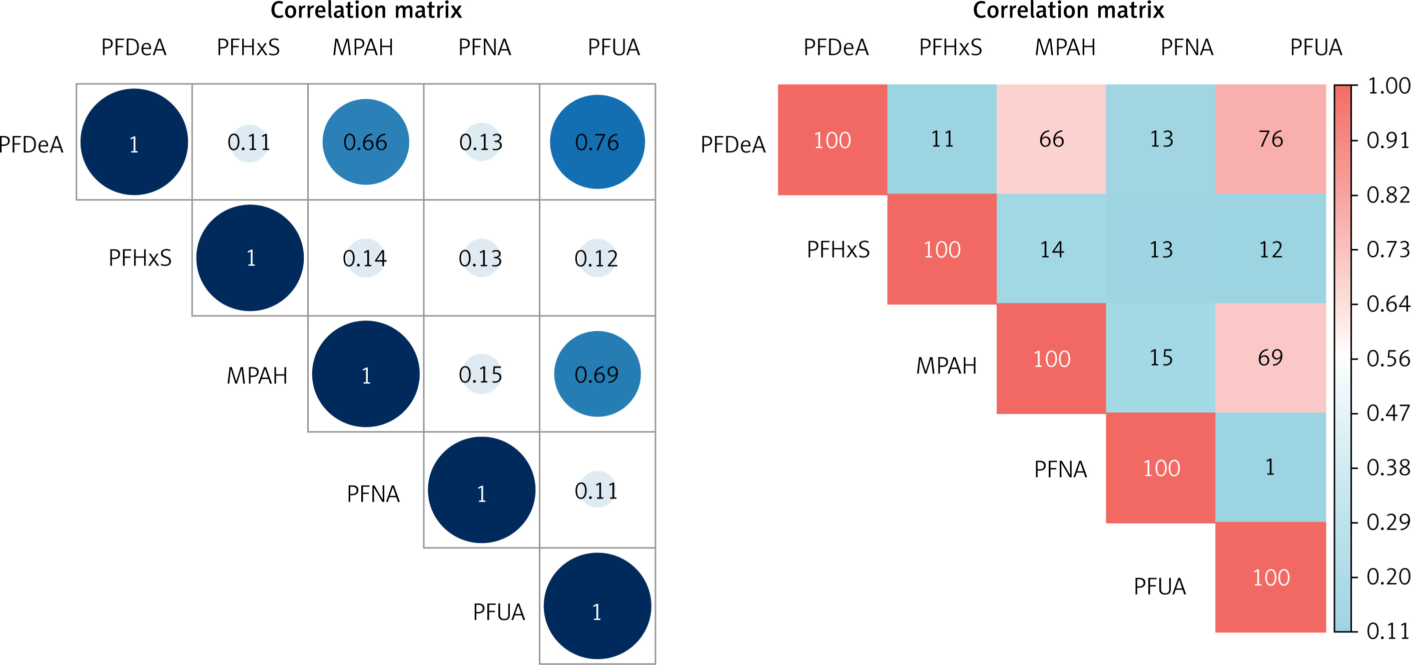 A Spearman correlation analysis was conducted to investigate the relationship between the measured values of the five chemicals, as shown in Figure 2. The results indicated that the correlation coefficient between PFUA and PFDeA was the highest at 0.76, suggesting a strong positive correlation. Furthermore, the correlation coefficient between PFUA and MPAH was 0.69, and that between PFDeA and MPAH was 0.66, both showing significant positive correlations. On the other hand, the correlation coefficients for the remaining chemicals were below 0.2, indicating either a very weak correlation or no correlation at all. This suggests the possibility of high collinearity among the variables, necessitating the use of multivariate logistic regression to evaluate and confirm the collinearity.