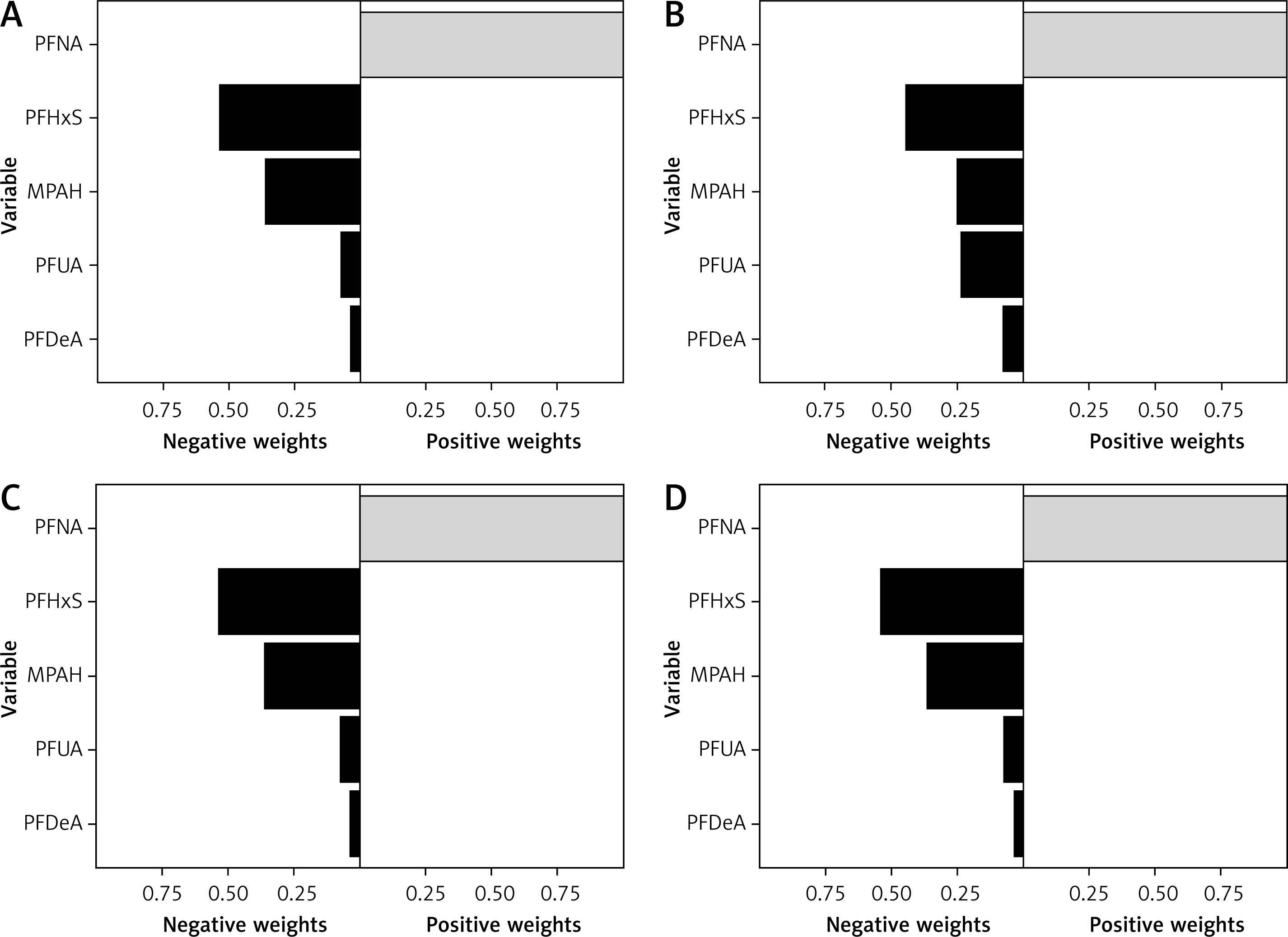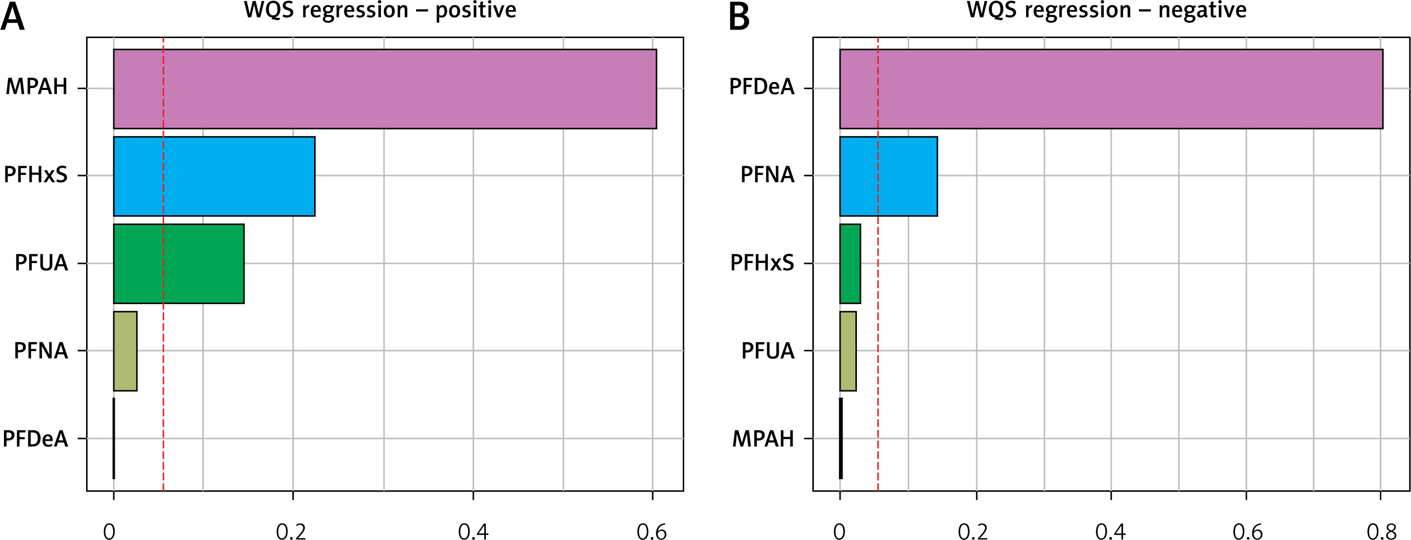 In the positive constraint model of WQS, the substances MPAH, PFHxS, and PFUA are considered to be relatively significant, with weights exceeding 1/18 each. Similarly, within the negative constraint model of WQS, both PFDeA and PFNA are deemed to be relatively important, with weights surpassing 1/18 for each chemical. For more detailed information, see Figure 3.