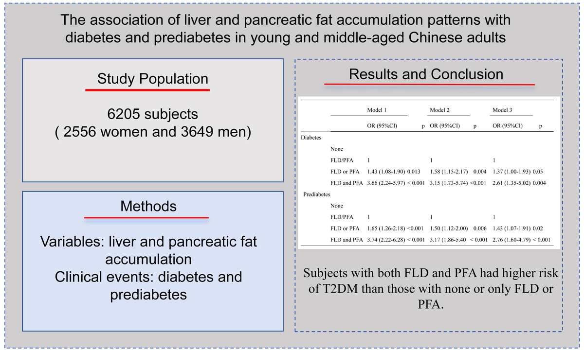 The combined role of fatty liver disease (FLD) and pancreatic fat accumulation (PFA) in diabetes is unknown. In the present study, we aimed to evaluate the relationship between the phenotype of FLD and PFA and type 2 diabetes mellitus (T2DM) or prediabetes in young and middle-aged adults.